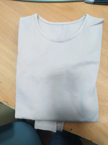 Ориентировалась на таблицу размеров. Заказала М. Но большевата. Ткань качественная плотная, не просвечивает. Однако вырез не соответствует фотографии. Вырез намного меньше, чем должен быть