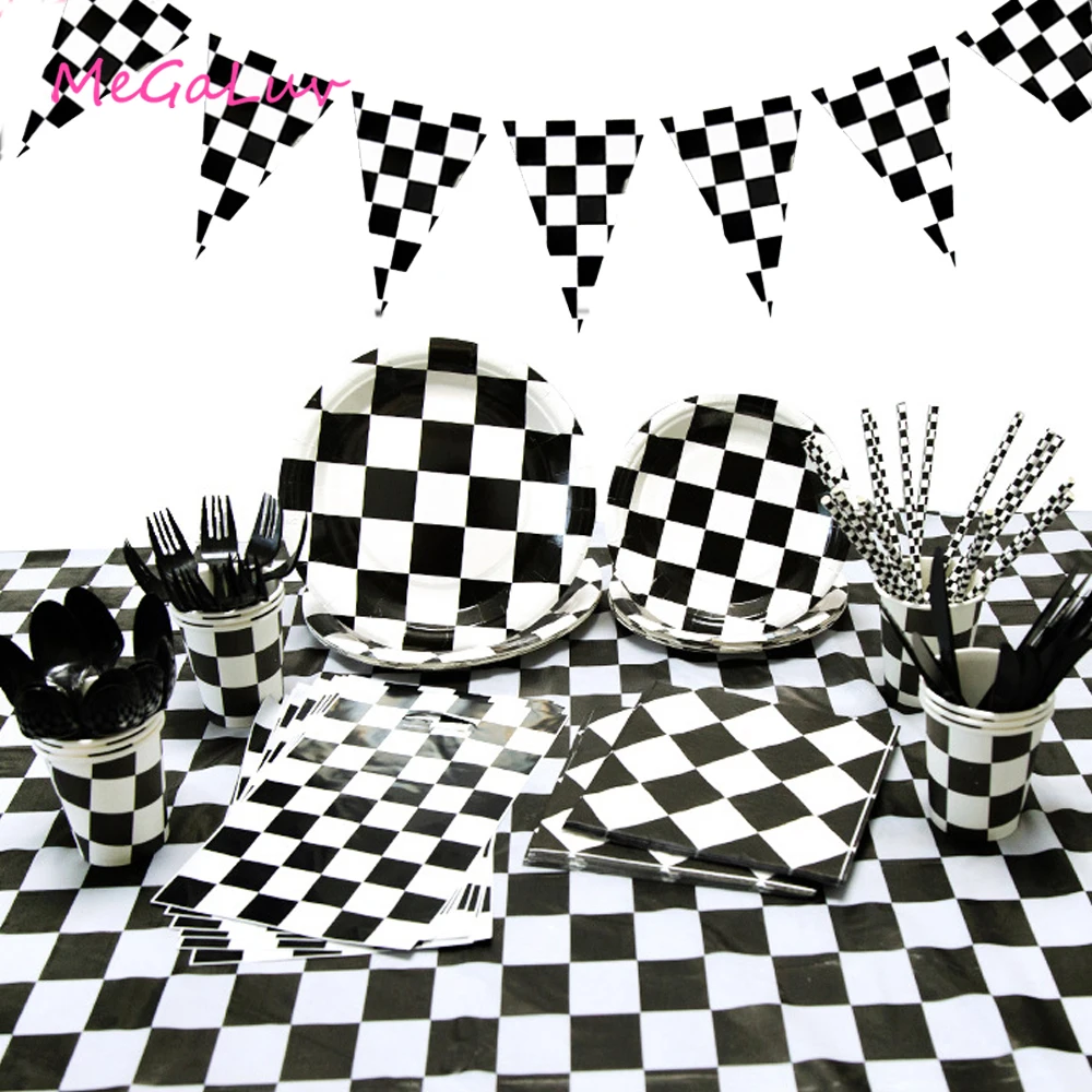 Гонки набор одноразовой посуды набор тарелок торт Топпер флажки украшение на день рождения черно-белая клетчатая посуда шары
