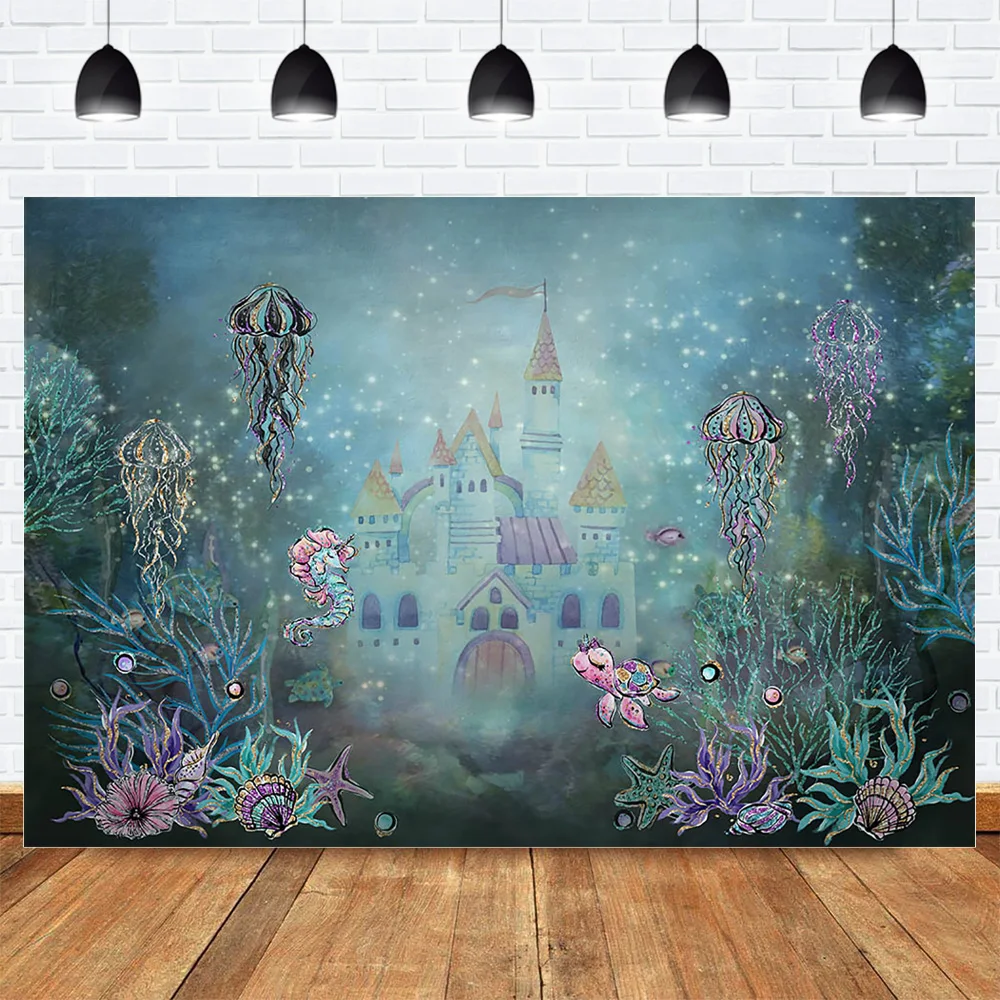 Подводный замок фон Русалка день рождения фон для фото на вечеринке синяя принцесса коралловый Медузы новорожденный портрет фотосессия