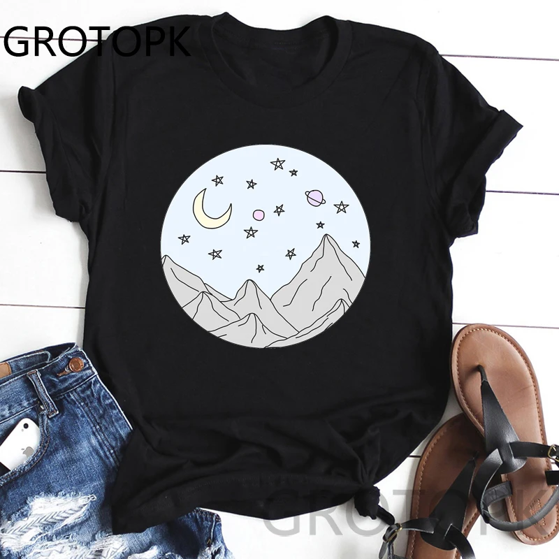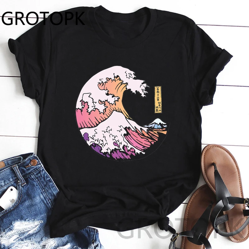 Женская черная футболка в стиле Харадзюку, футболка в японском стиле с принтом волн и Луны, уличные Топы в Корейском стиле, женские футболки