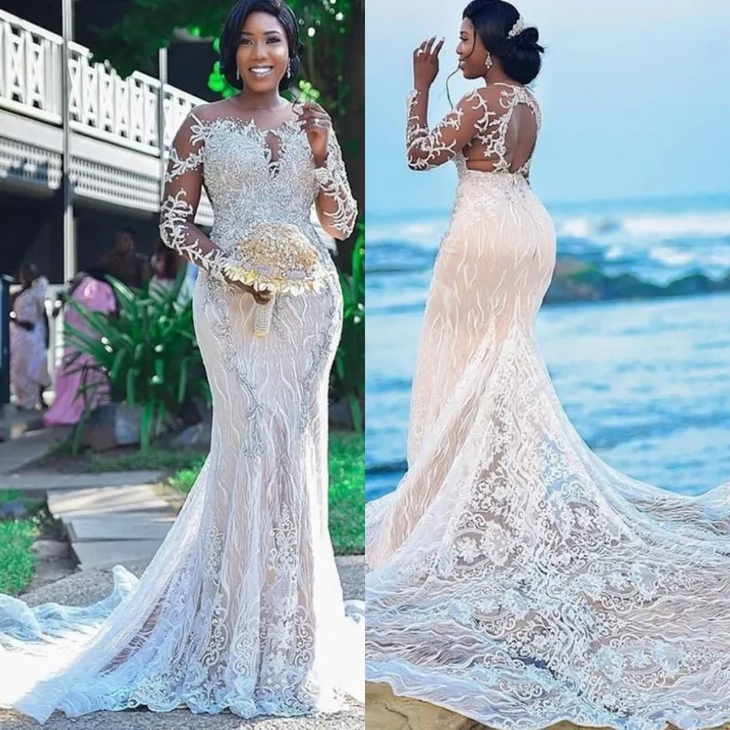Африканские размера плюс свадебные платья Sheer шеи robe de mariee Свадебные платья с низким вырезом на спине бисером Длинные рукава Кружева Русалка свадебное платье