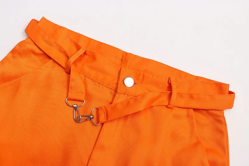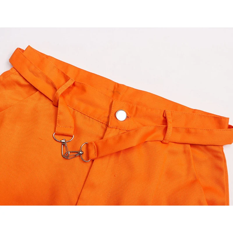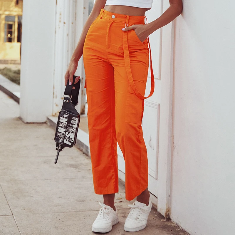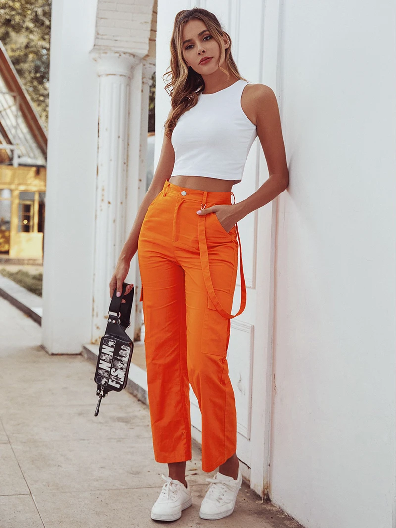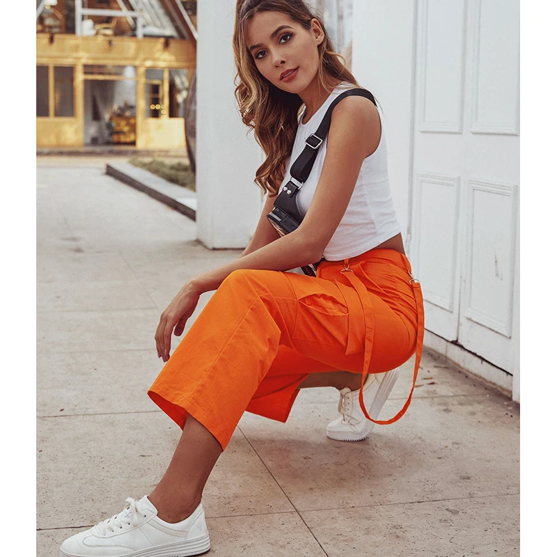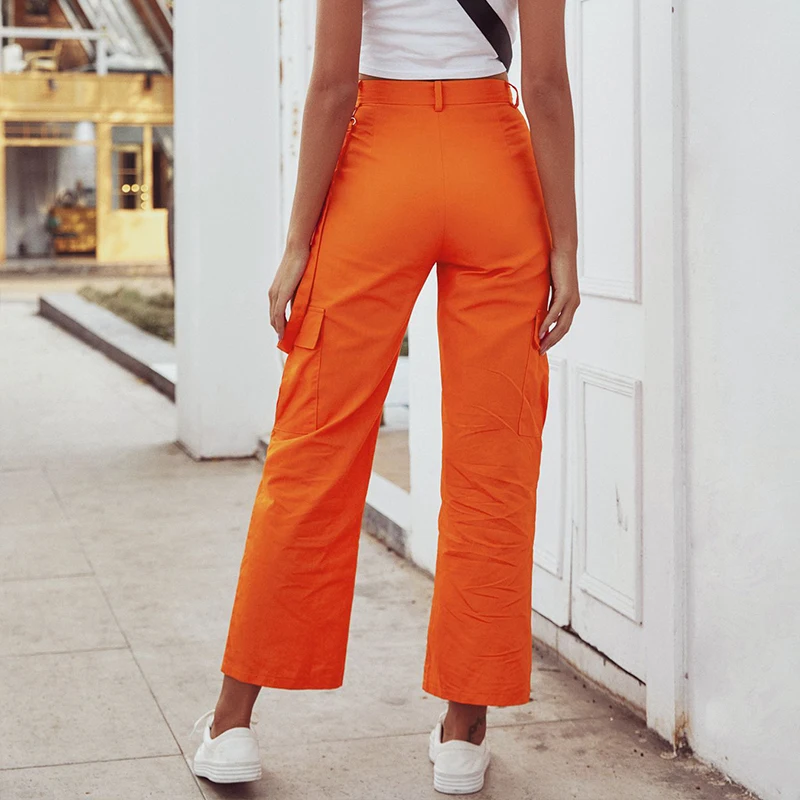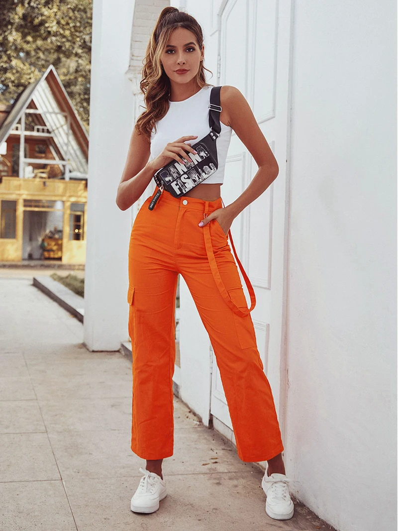 Брюки-карго женские прямые оранжевые с высокой талией, с карманами