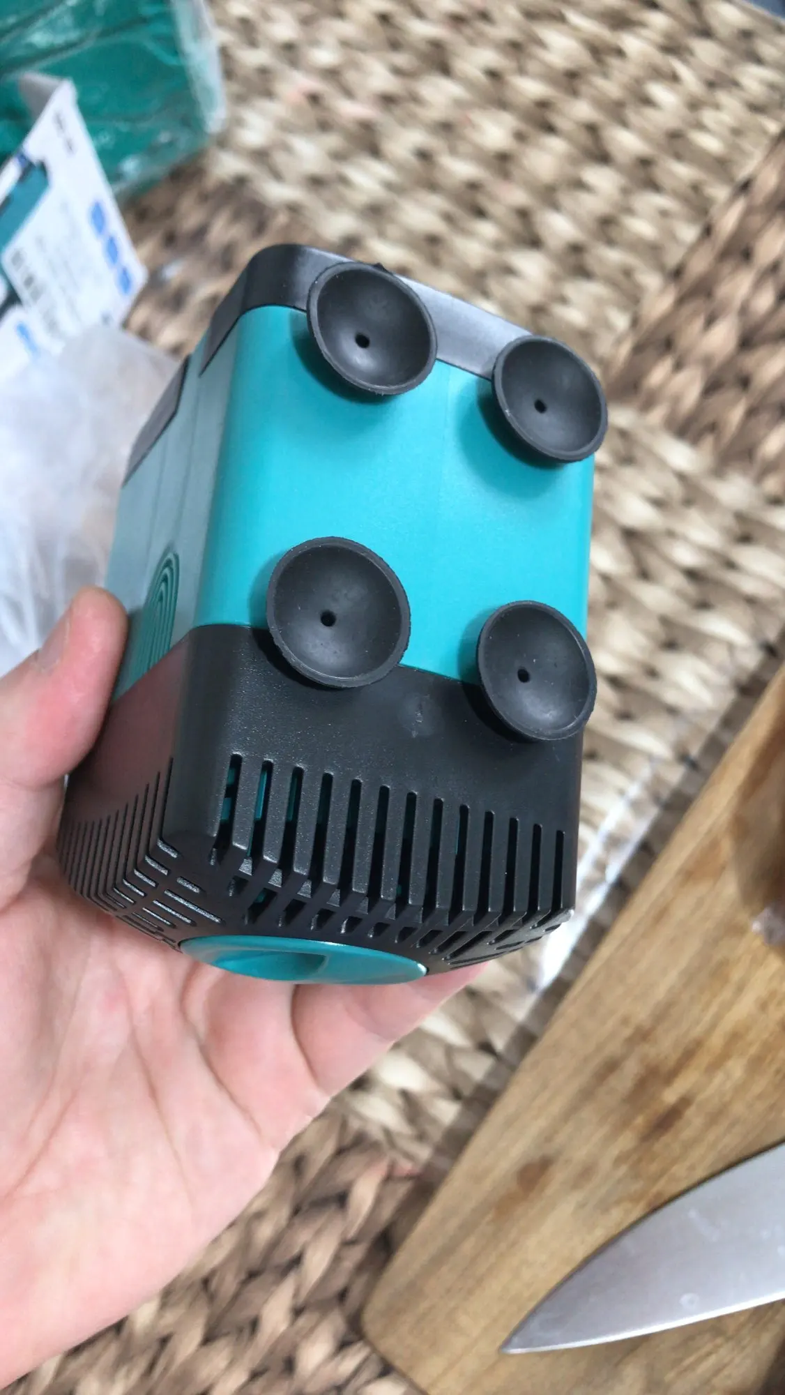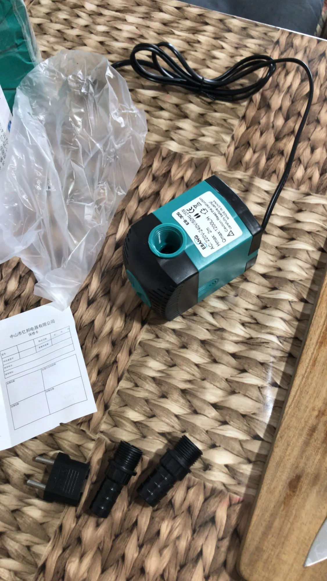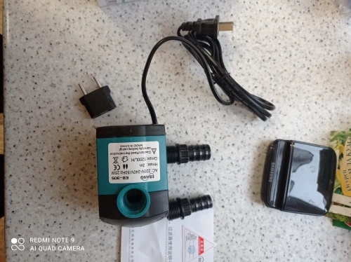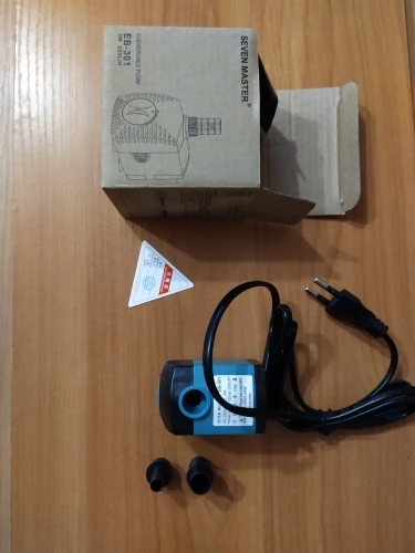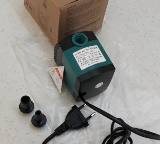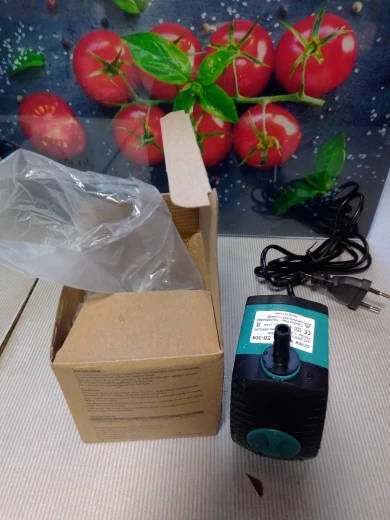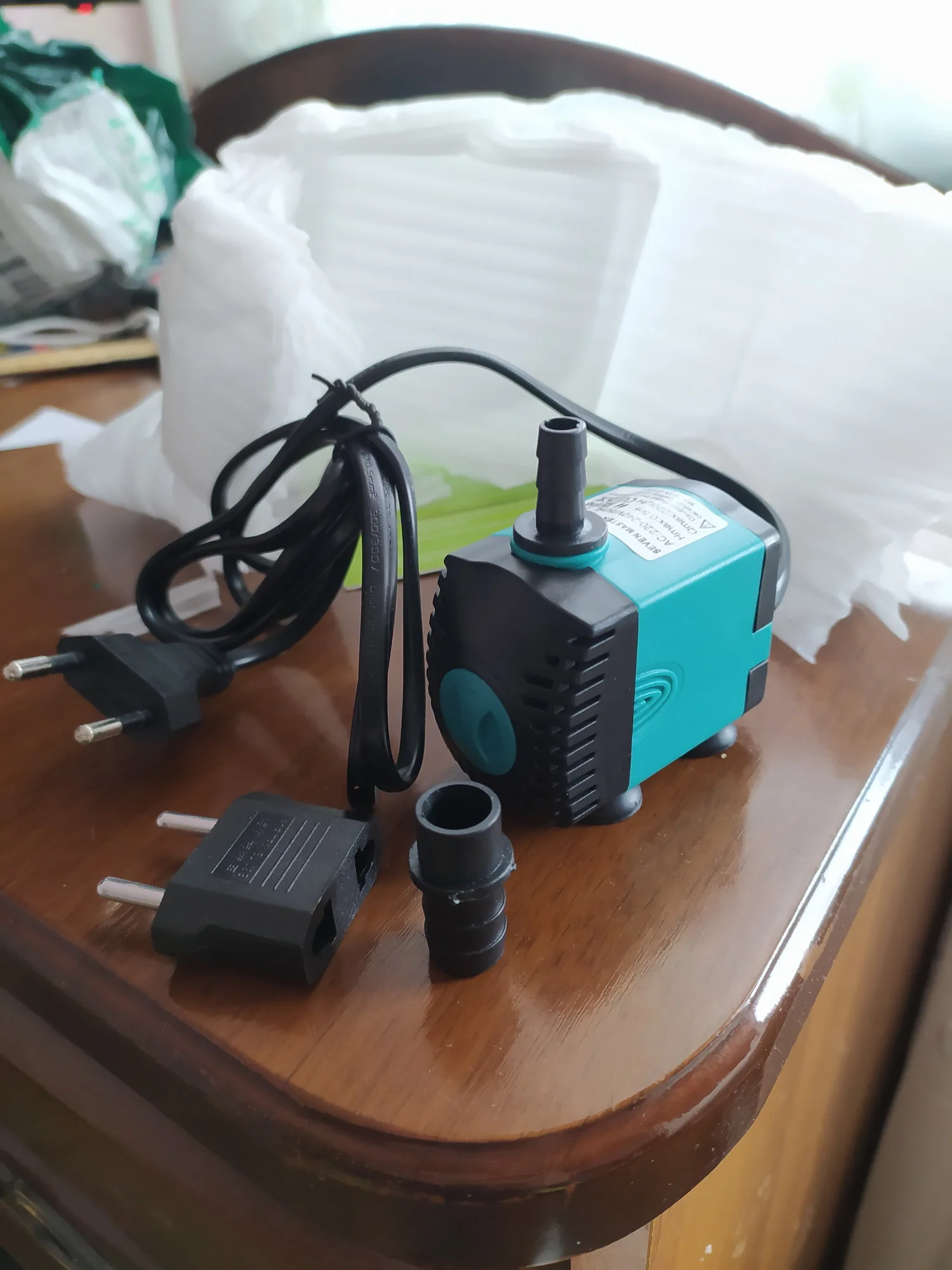 Ехал насос в Украину долговато и почему то через Латвию, в общем где-то полтора месяца) Достаточно мощный для 3 Вт, хорошо подошёл в круглый маленький 7,5 л аквариум, хорошо прицепился на стенку из за 4 присосок снизу) первые фото без воды, последнее уже с ней)