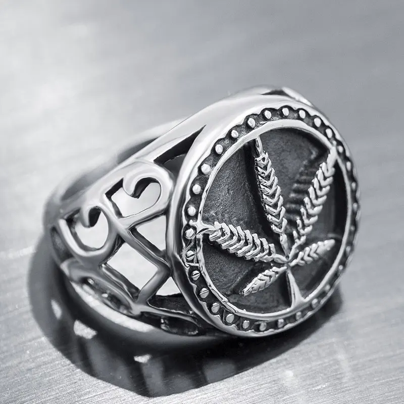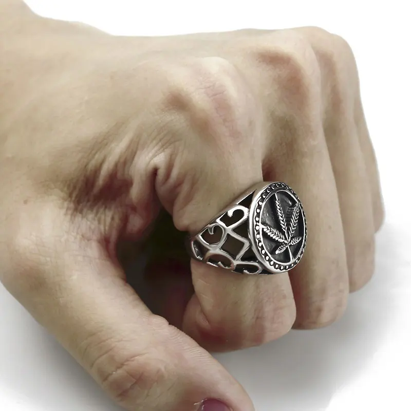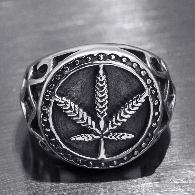 Винтаж Нержавеющаясталь сорняк Конопля Cannabises перстень панк узо...
