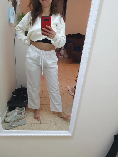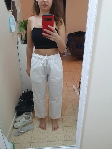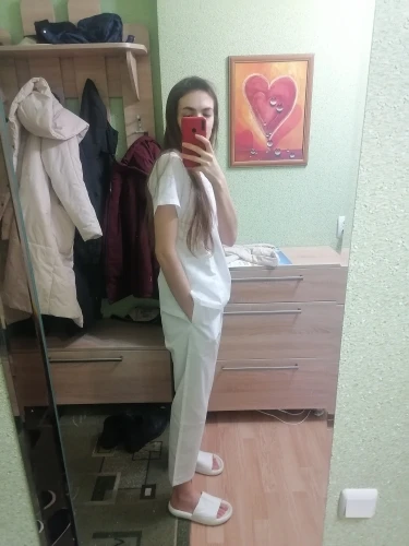 Ткань очень плотная, летом носить точно не получится Пришла за неделю, обычно заказы долго жду Обратная сторона прилипает, все время отдирать надо, с обратной стороны утюжить не получается, липнет Штаны широкие, но резинка на талии хорошая, карманы хорошие, нитки не торчат, для высоких не подойдёт, у меня рост 156, уже чуть чуть короче