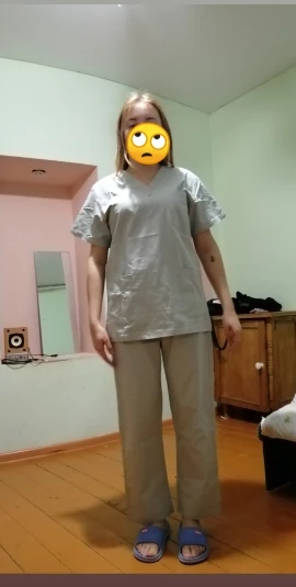 Все хорошо, размер м на 169 см 58 кг подошел. Брюки до щиколотки, высокая талия. Верх свободен- будет комфортно работать. Прибыл быстро около 2 недель.