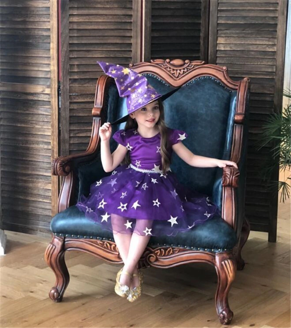 Костюм ведьмы для девочек на Рождество, Хэллоуин, новогоднее платье для младенцев, вышитая Юбка со звездами, фиолетовое, красное, черное платье для девочек