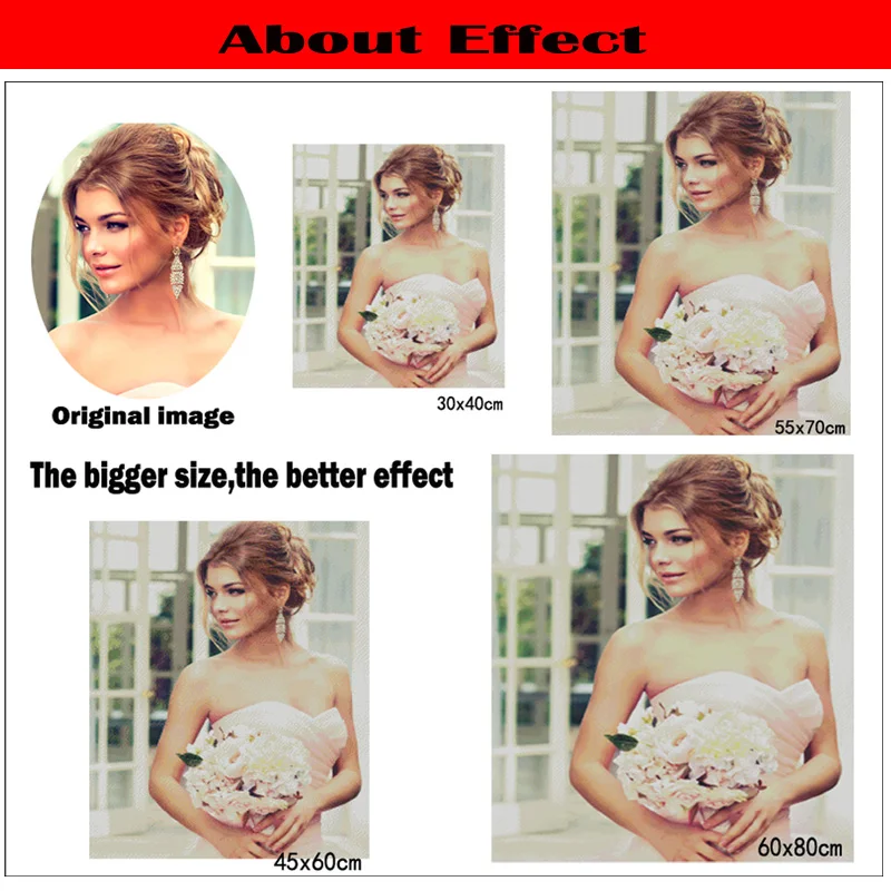 Обычно сложные красочные изображения с изящными деталями требуют большего размера, чтобы выразить детали. И если вы хотите общий взгляд на эффект каждого размера, следующее изображение только для справки. Вы также можете оставить нам сообщение, если вам нужен больший размер или у вас есть другие вопросы.