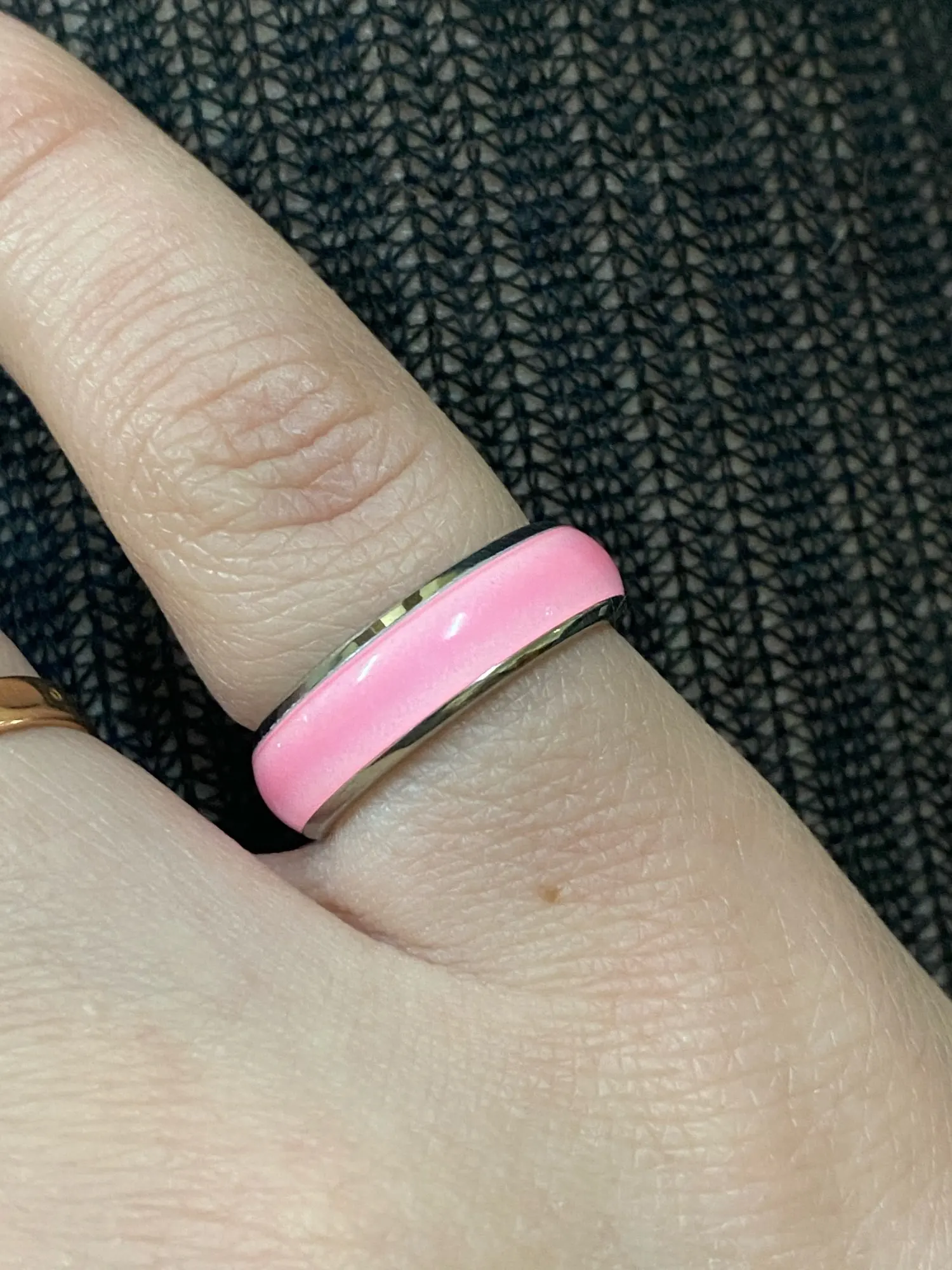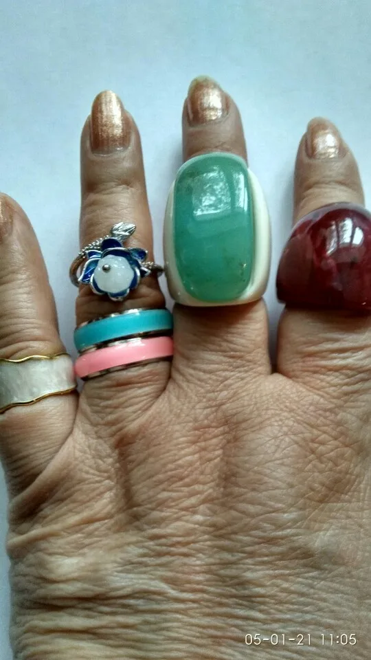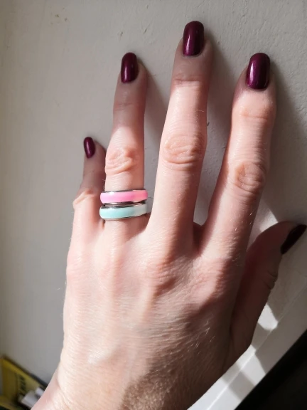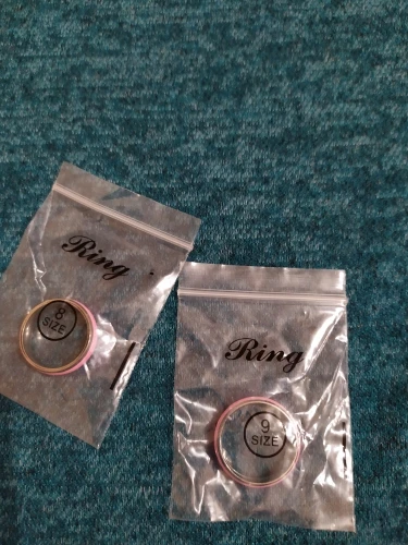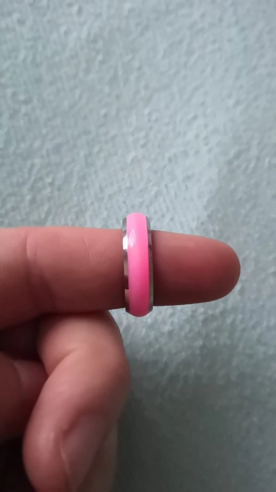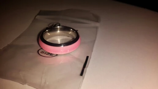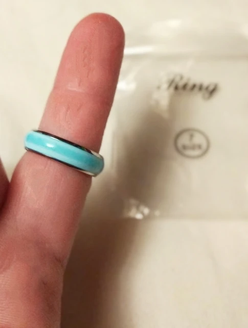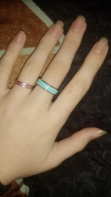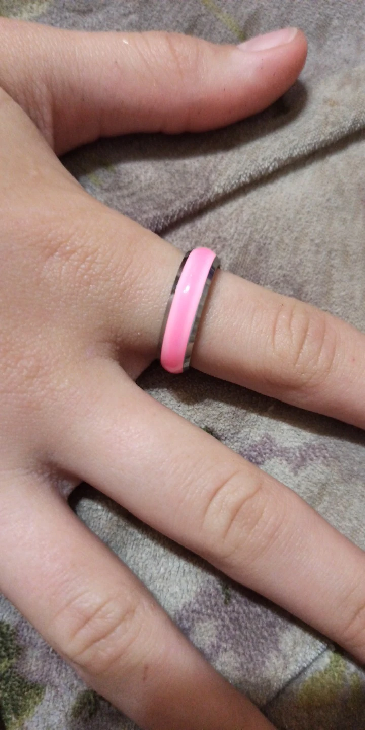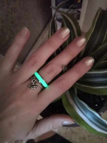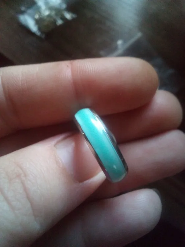Самые удобные кольца размера 6 в моей жизни, как в описании - светятся в темноте после записки от лампочки. Изначальный цвет похоже жёлтый, поэтому, проходя через цветную эмаль немного меняются.