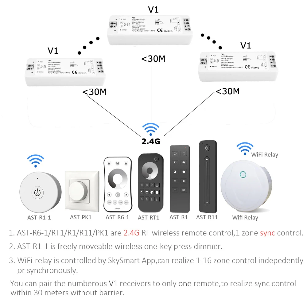 ● Подходит для использования в одной зоне Skydance 2,4G или с пультом дистанционного управления с затемнением нескольких зон.
