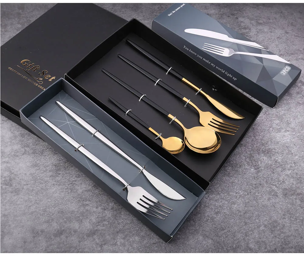 1 × длина ножа: 22 см ------------------------------------------------------ 1 × длина обеденной ложки: 20,7 см ------------------------------------------------------ 1 ×dinner вилка Длина: 21,5 см ------------------------------------------------------ 1 × длина чайной ложки: 13 см ------------------------------------------------------ Всего 4 штуки в наборе, нож + ложка + вилка + чайная ложка, по 1 штуке каждого, обслуживание для 1 пользователя. ------------------------------------------------------- Упаковка: Подарочная коробка ------------------------------------------------------- Качество продукции: первоклассный (безопасная нержавеющая сталь)