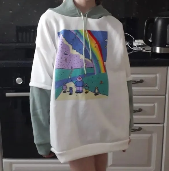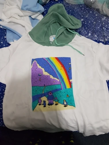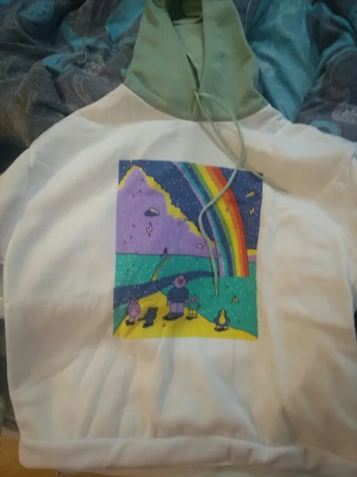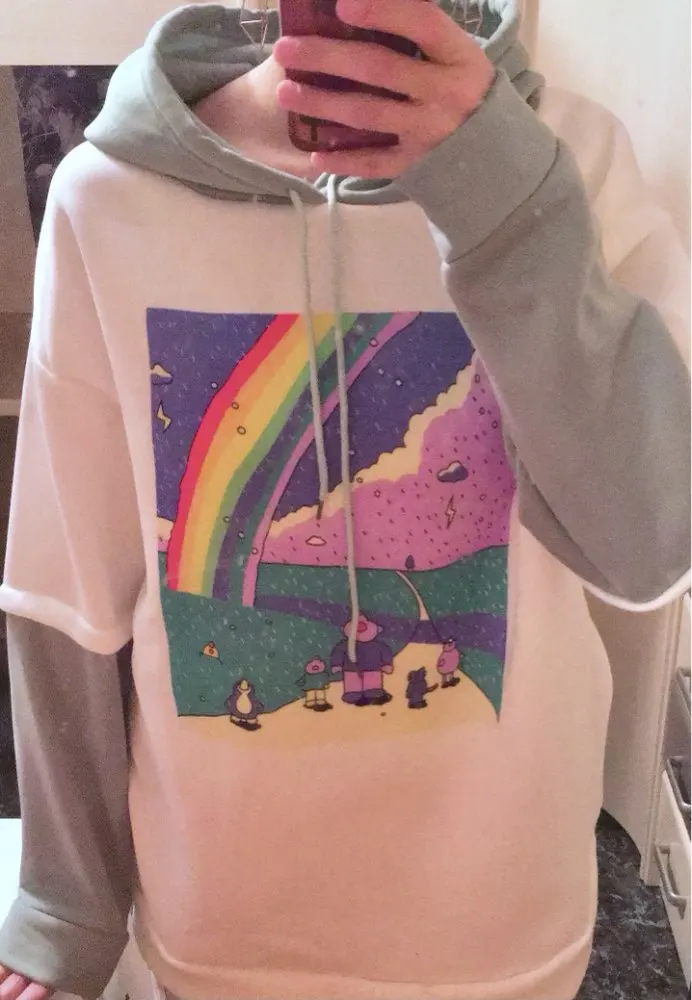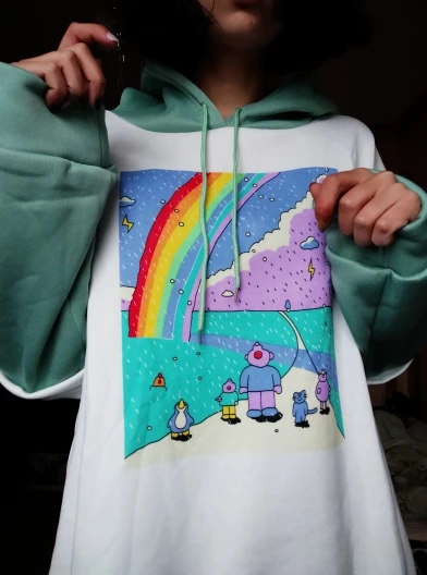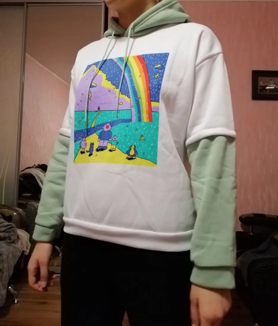 Центральный принт вовсе не тех гармонирующих с цветом рукавов оттенков, а гораздо ярче. И качество не то - в магазине на фото принт чёткий, а в реальности чуть подплывший... Однако сама толстовка симпатичная, внутри мягкая. Дочь довольна. Пришёл заказ быстро, и отправили быстро. Спасибо!