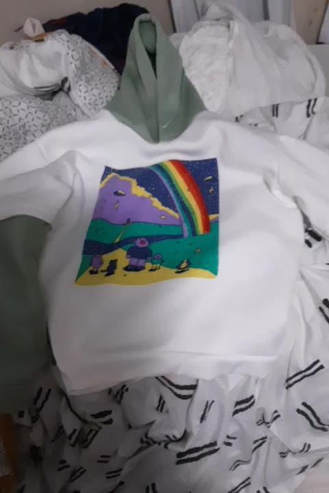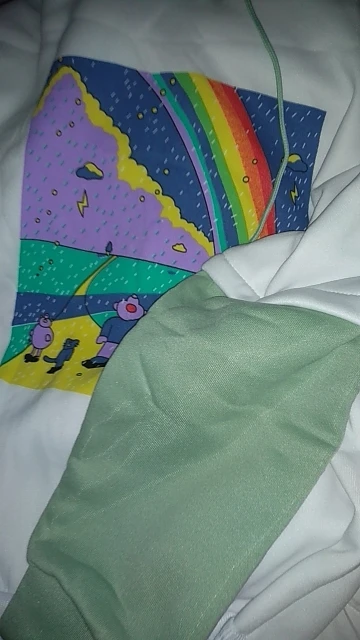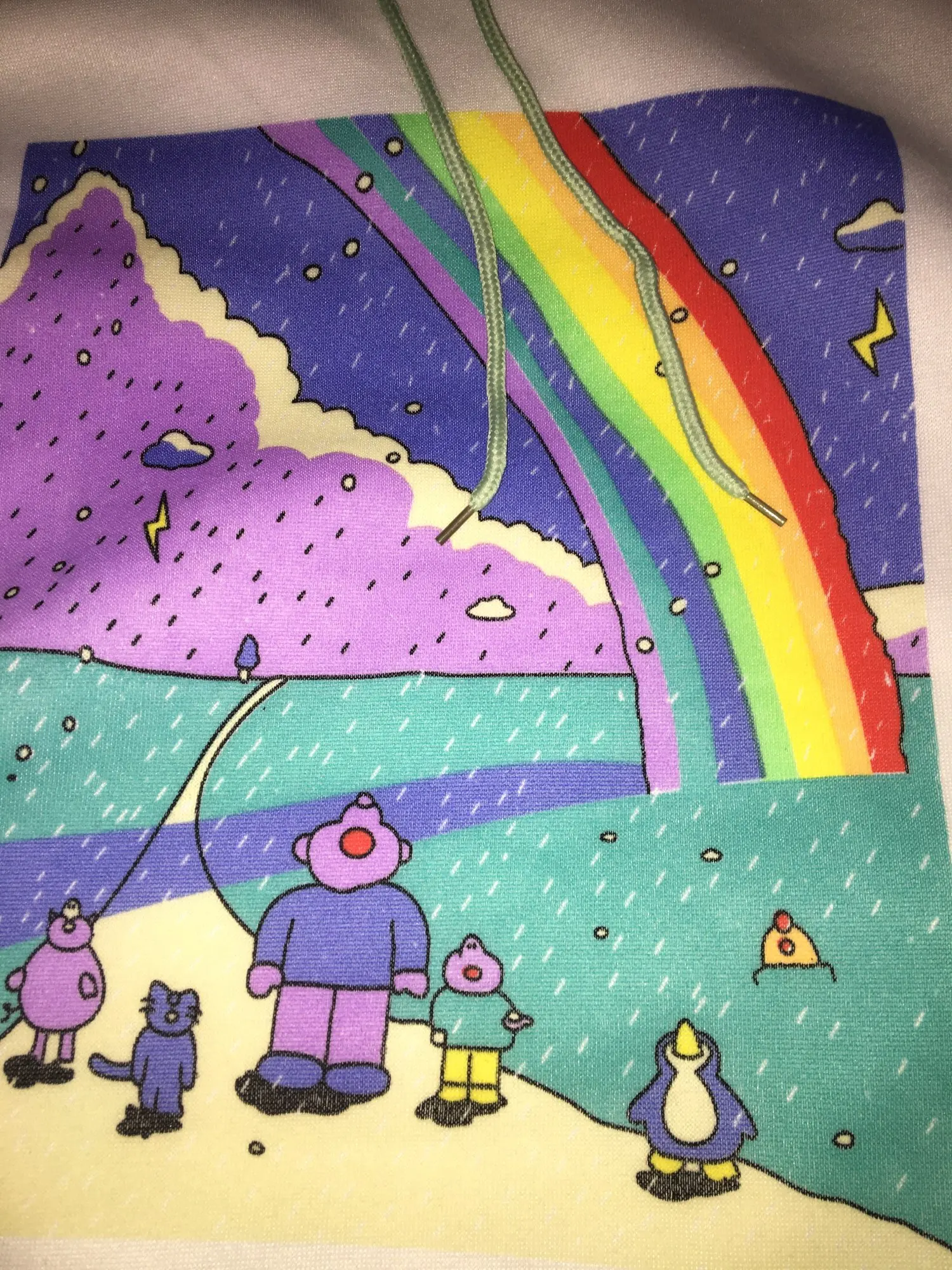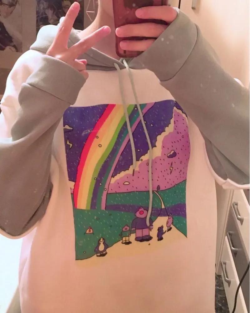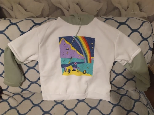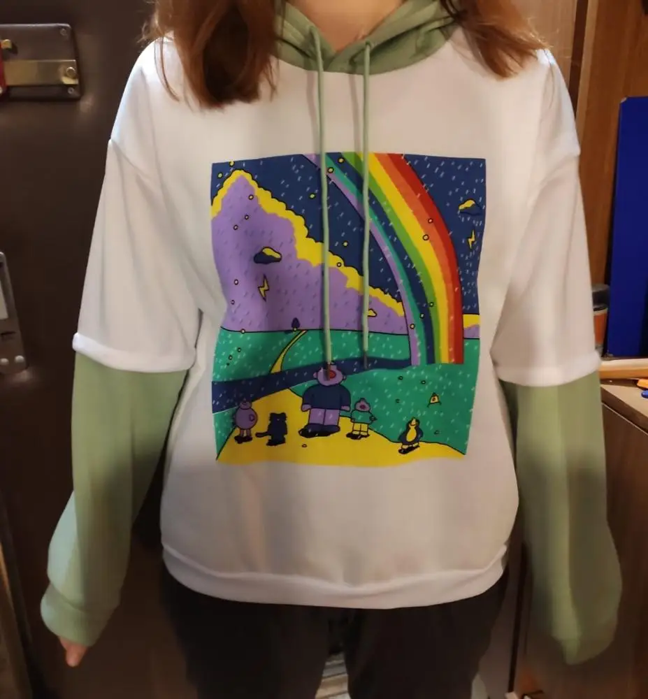 Центральный принт вовсе не тех гармонирующих с цветом рукавов оттенков, а гораздо ярче. И качество не то - в магазине на фото принт чёткий, а в реальности чуть подплывший... Однако сама толстовка симпатичная, внутри мягкая. Дочь довольна. Пришёл заказ быстро, и отправили быстро. Спасибо!