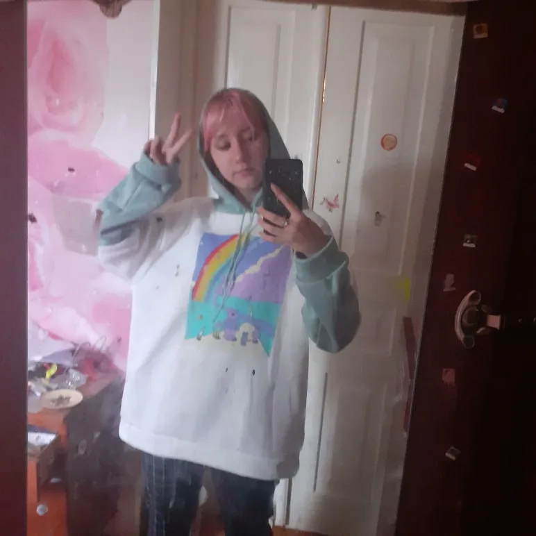 Я влюбилась в эту толстовку, она просто идеальна! Принт намного ярче, чем на фото. На крупную девушку ОГ - 105, ОТ-95 - размер подошёл отлично