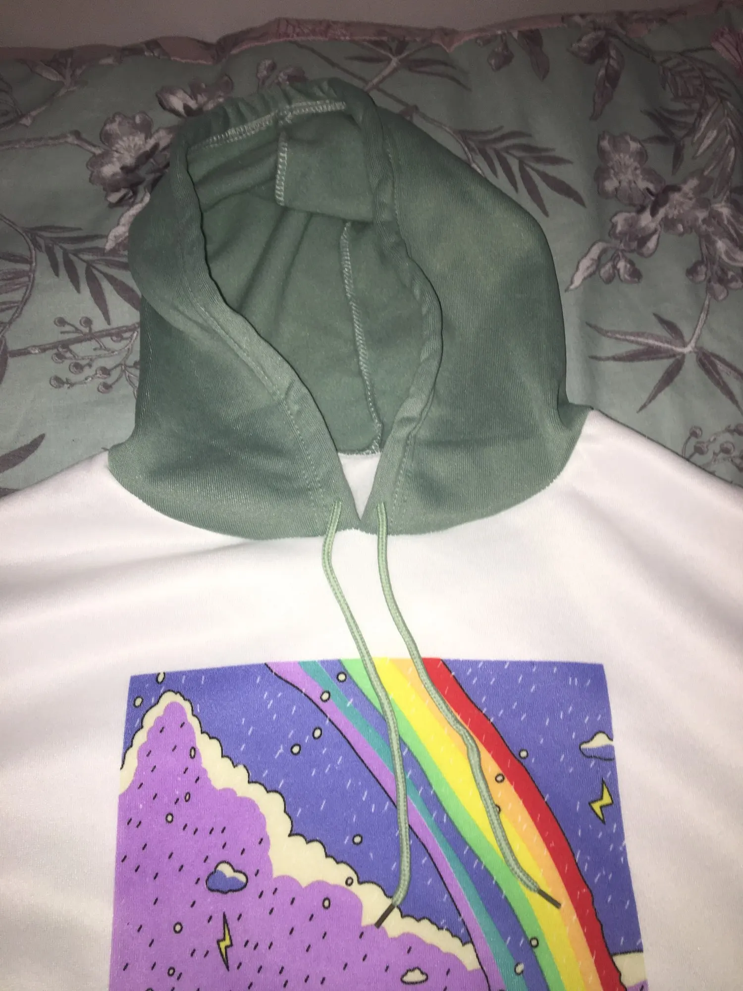 приехала за три с половиной недели, качество очень хорошее, очень мягкая ткань, принт не наклеен и никаких свойств после стирки не потерял. Не выцвел. Были небольшие пятна, но очень легко отстирались, брала xxl на s, чтобы был оверсайз, не ошиблась, сидит очень хорошо, теплая)