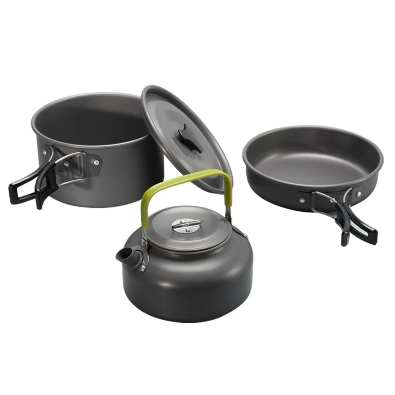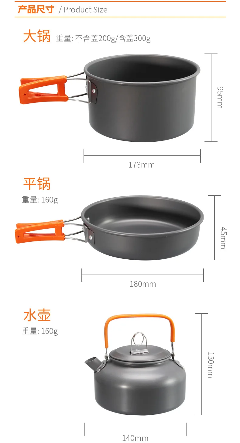 Портативный набор посуды из сплава для кемпинга, большая кастрюля для пикника, сковорода, чайник для воды, набор с сумкой DS308