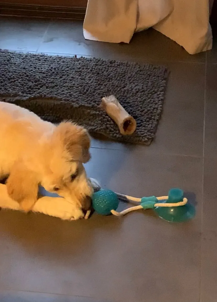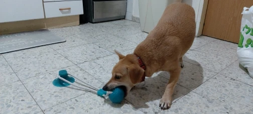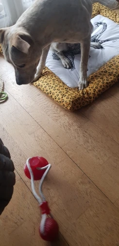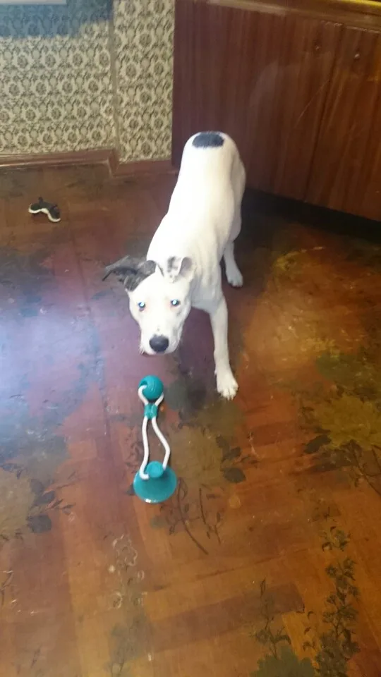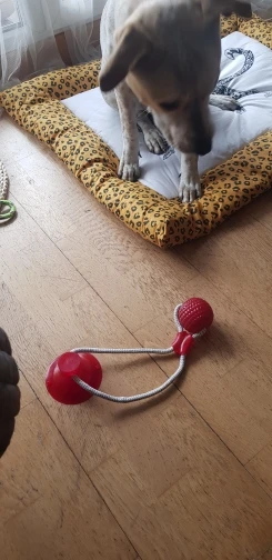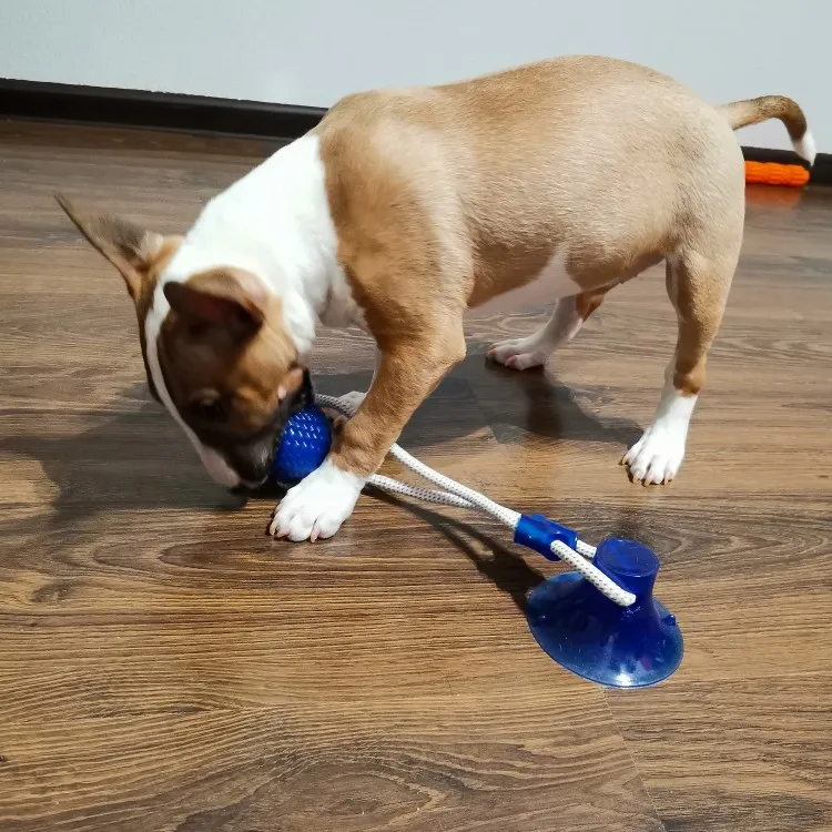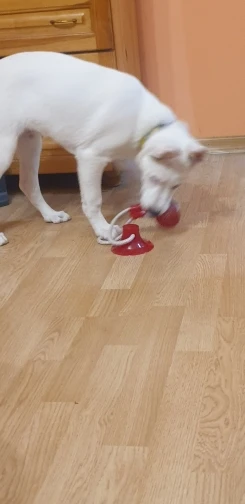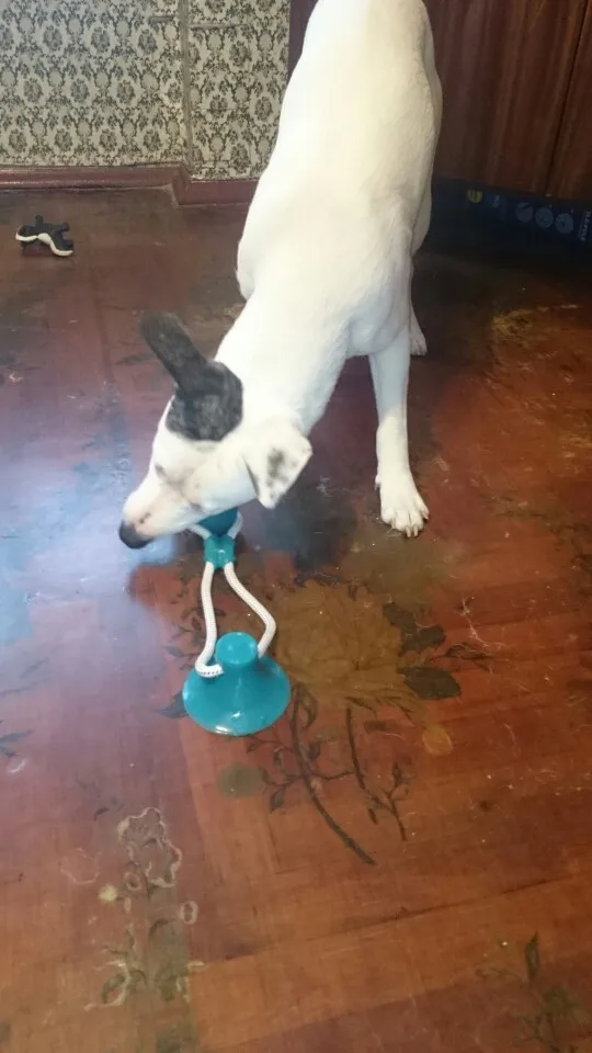 собаке (джек рассел терьер) не очень интересна эта игрушка. достаточно плохая присоска - липнет только к очень ровным поверхностям. на напольной плитке с выработкой и ламинате у нас не держится. к продавцу претензий нет - все отправил быстро.