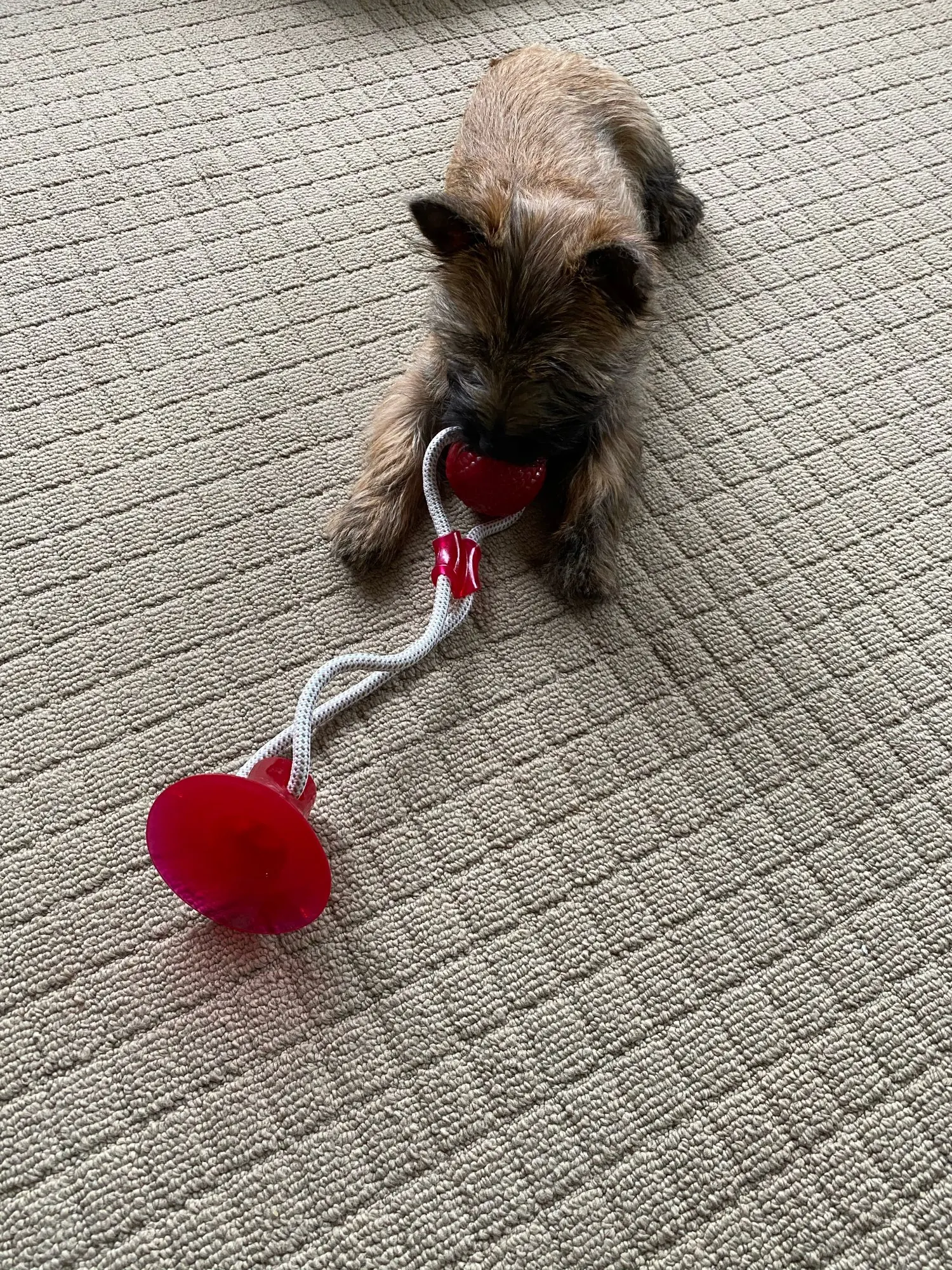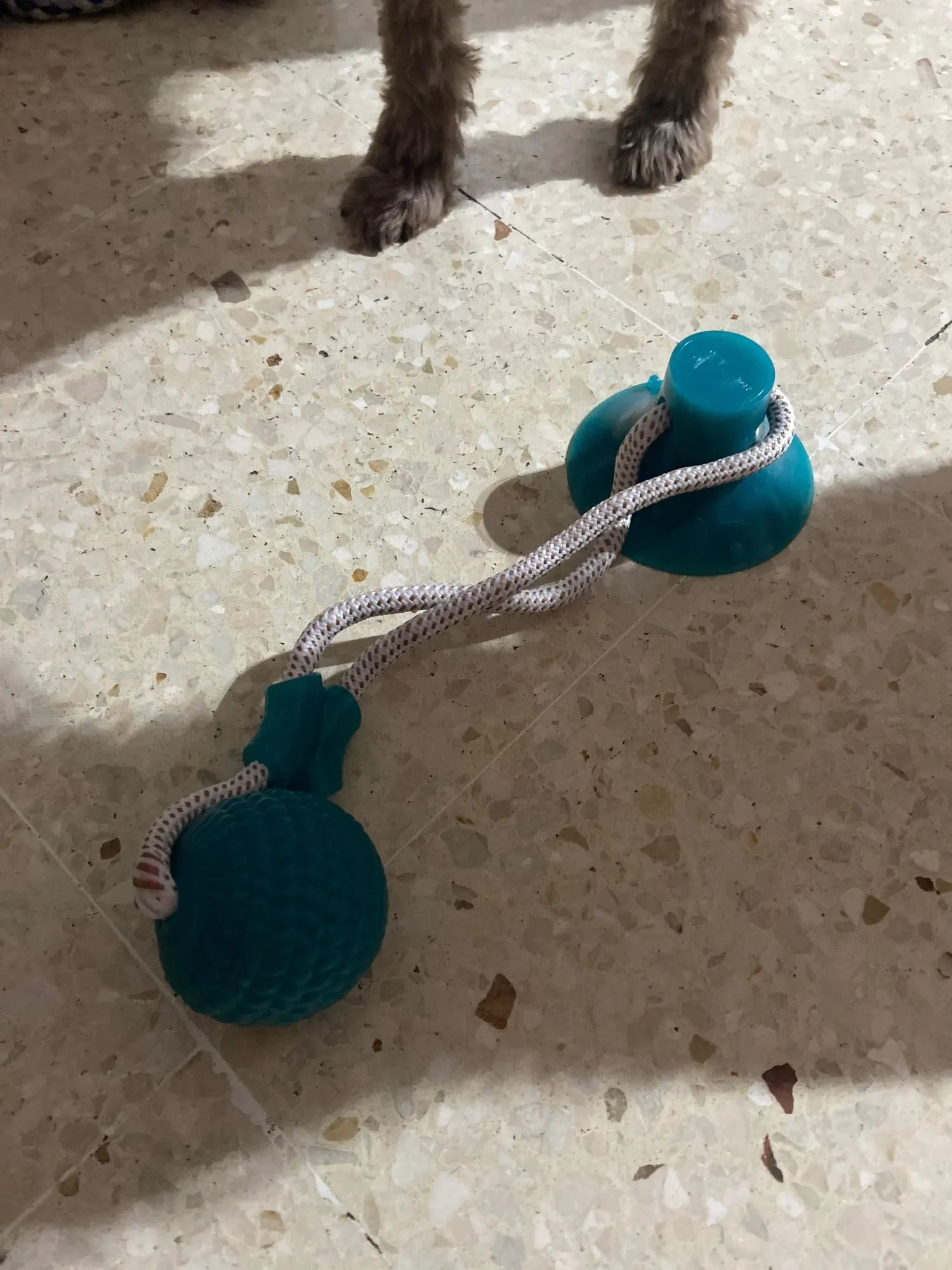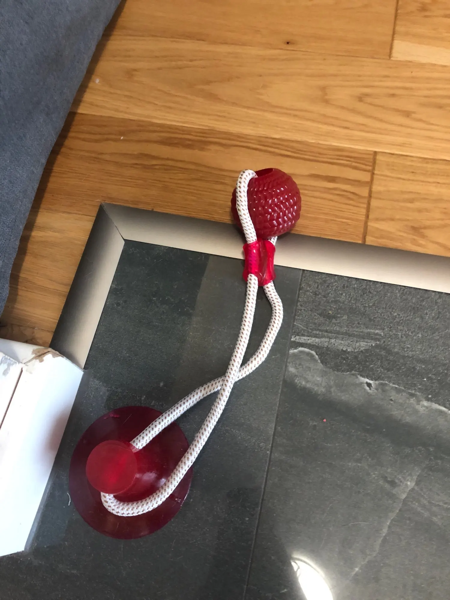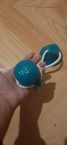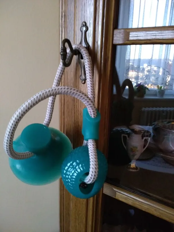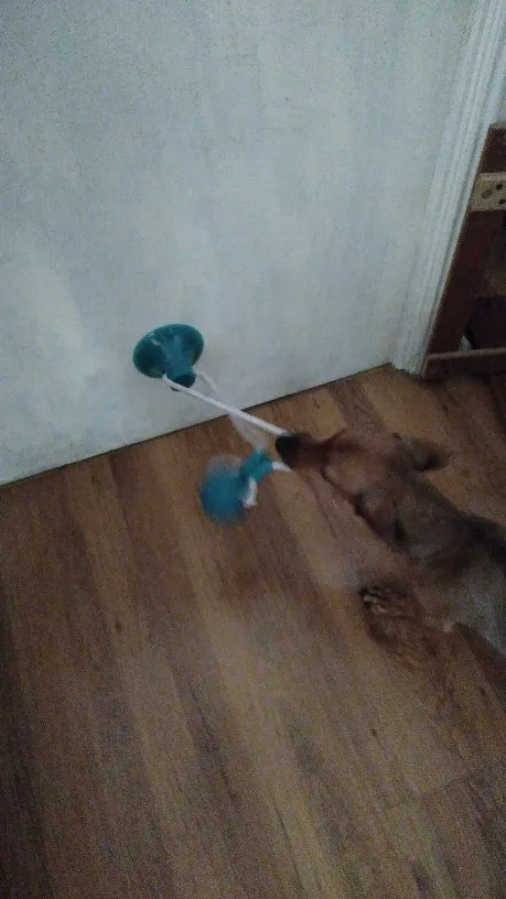 Собачка грызёт веревку и она уже начала трепаться. Тяжело прилепить присоску .