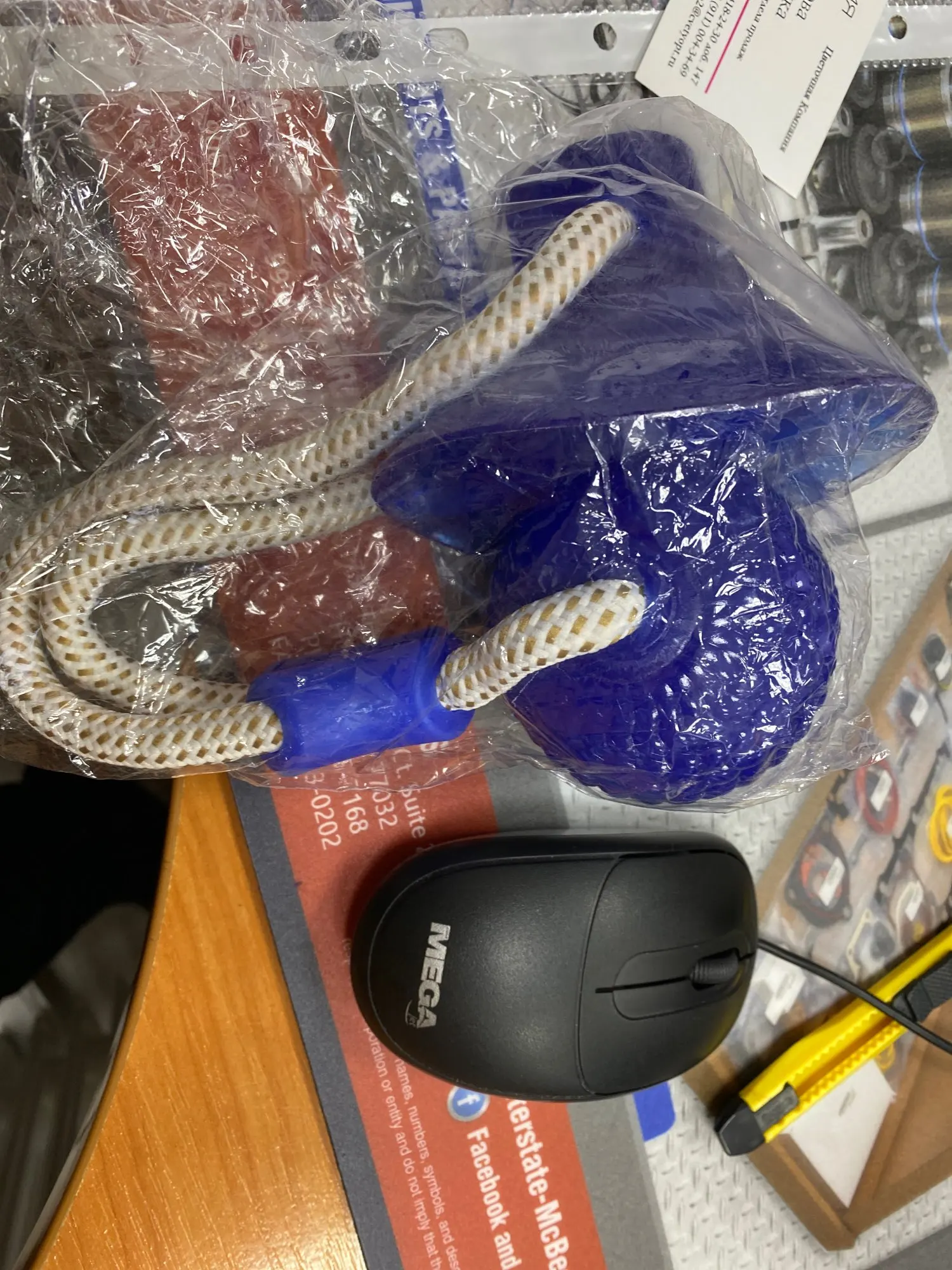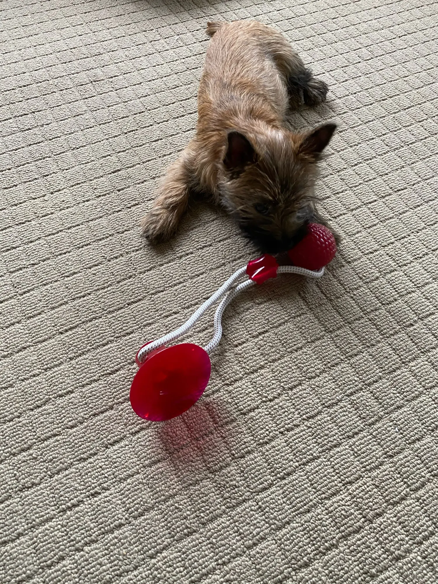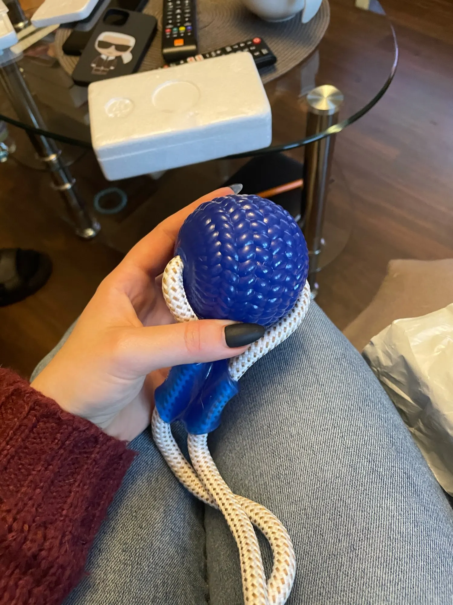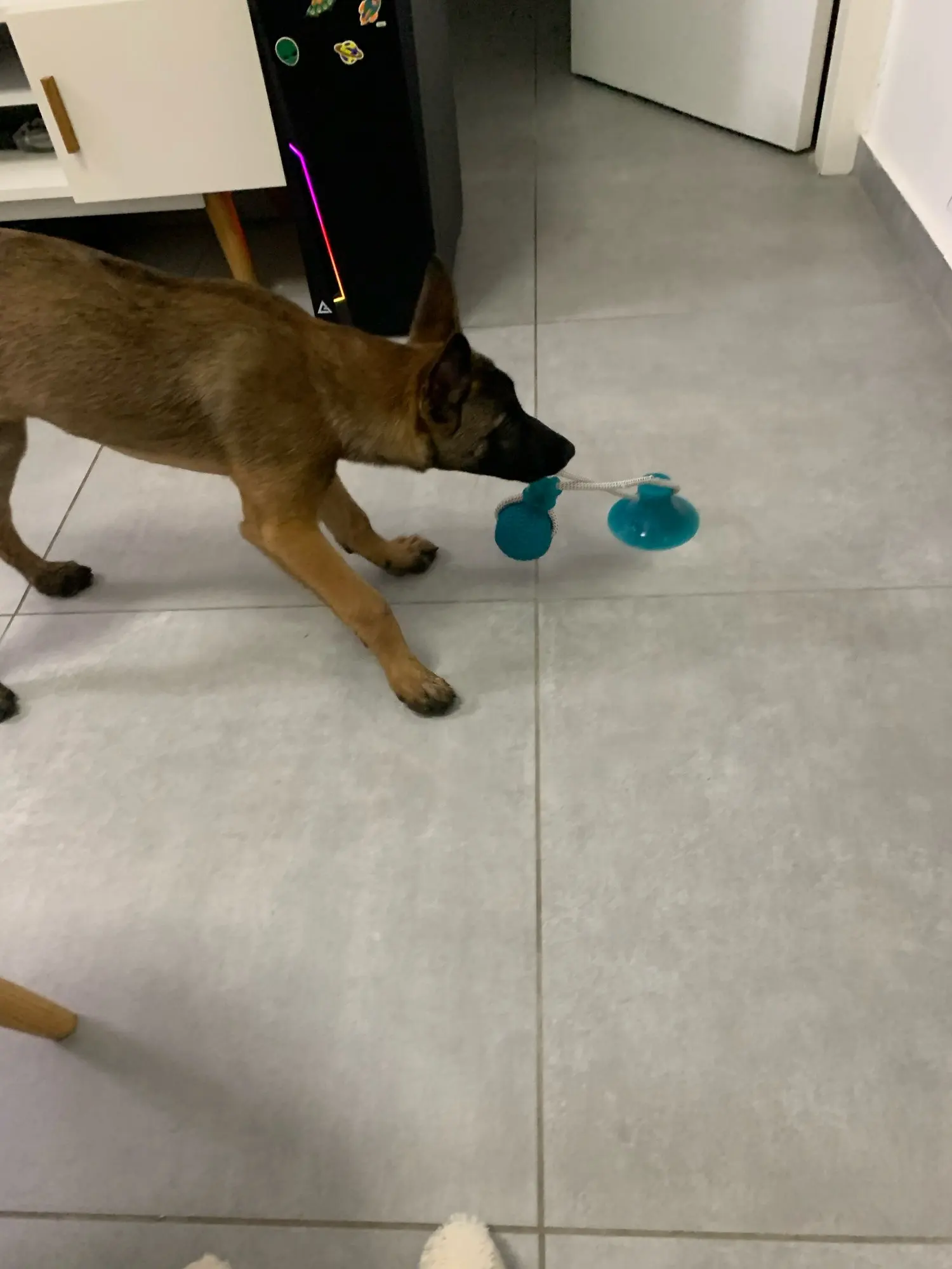 Собачка грызёт веревку и она уже начала трепаться. Тяжело прилепить присоску .