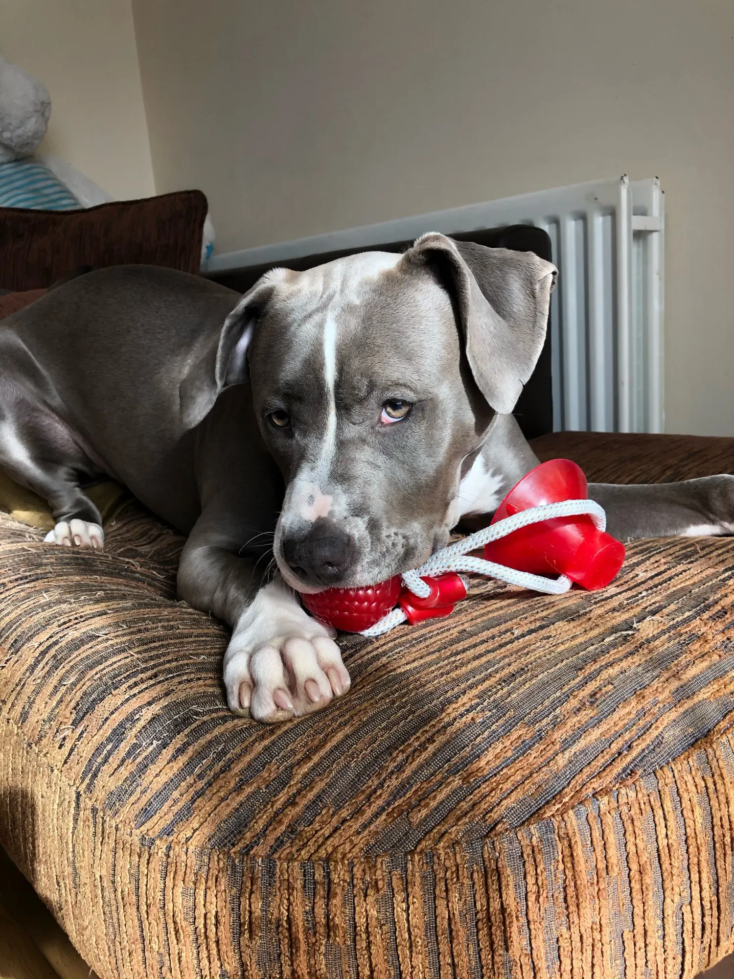 классная игрушка, ещё пока не изгрызена только у нас дома не к чему не крепится