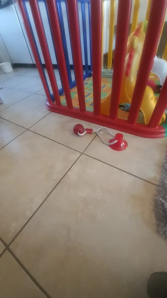 Крепиться даже к ламинату достаточно хорошо. Молодой таксе очень даже нравится. Если мячик будет большой для вашей собаки, его снять и привязать то, что пёс любит тянуть, нет никакого труда.