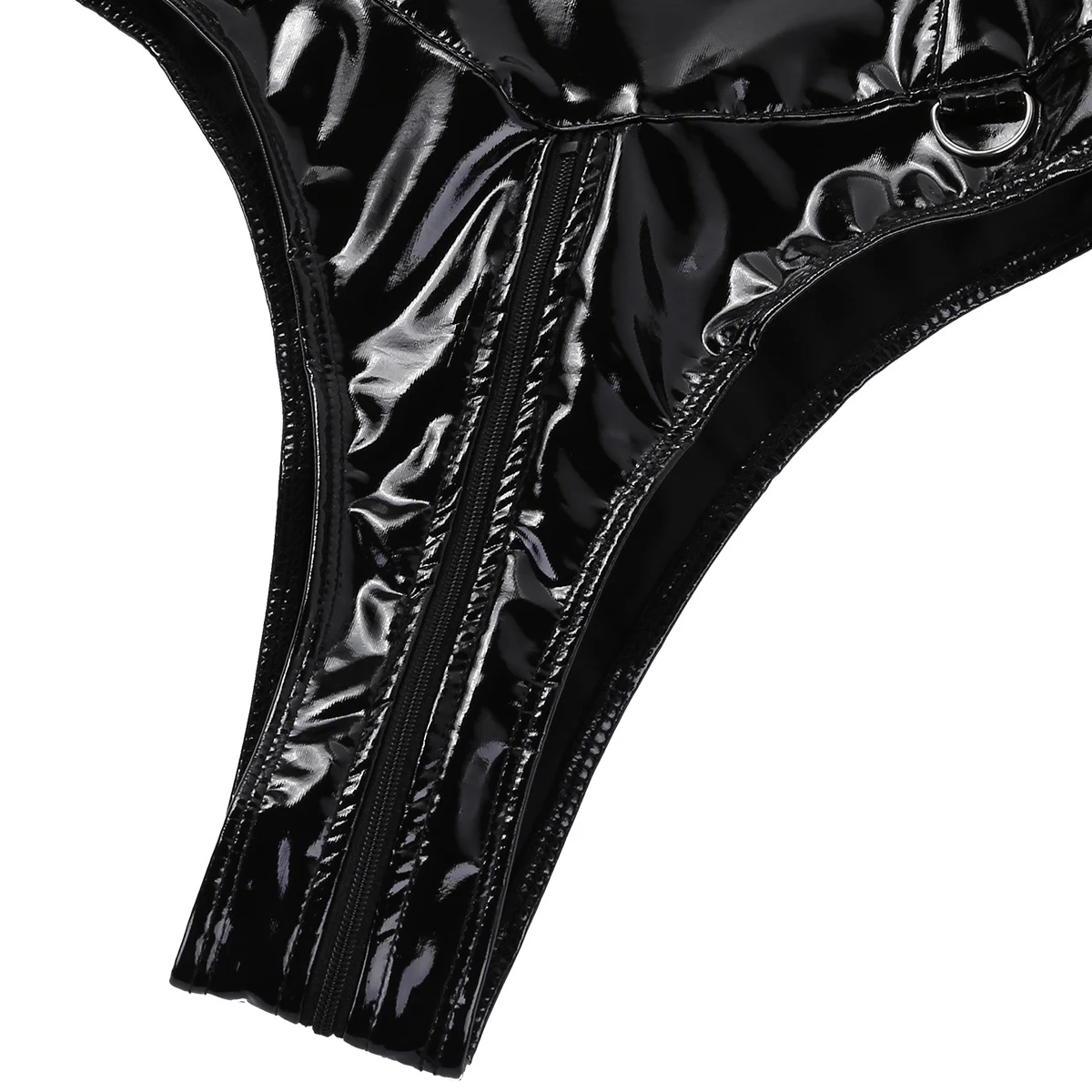 Женское кожаное сексуальное боди с мокрым эффектом, латексный комбинезон для танцев на Пилоне с открытой промежностью, Облегающий комбинезон с длинными рукавами и высоким вырезом, нижнее белье для ночных клубов