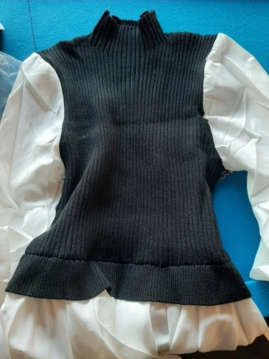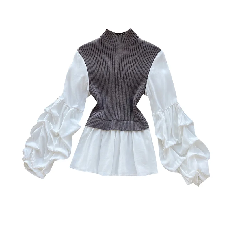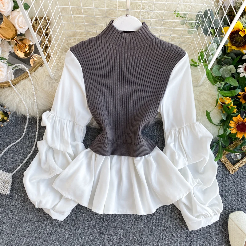 Женский трикотажный топ с имитацией двух предметов, Облегающая рубашка с рукавами-фонариками, водолазка, Пуловеры, свитеры, топы ML574