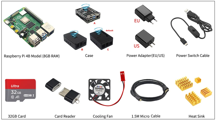 Оригинальный Raspberry Pi 4B 2 ГБ 4 ГБ 8 ГБ RAM Kit 5 в 3A адаптер питания + охлаждающий вентилятор + радиаторы + карта для Raspberry Pi 4 Model B