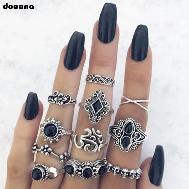 Docona 11 шт.компл. черный Стразы античный череп цветок кольцо для женщин женские Геометрические костяшки средней длины кольца ювелирные изделия 10057