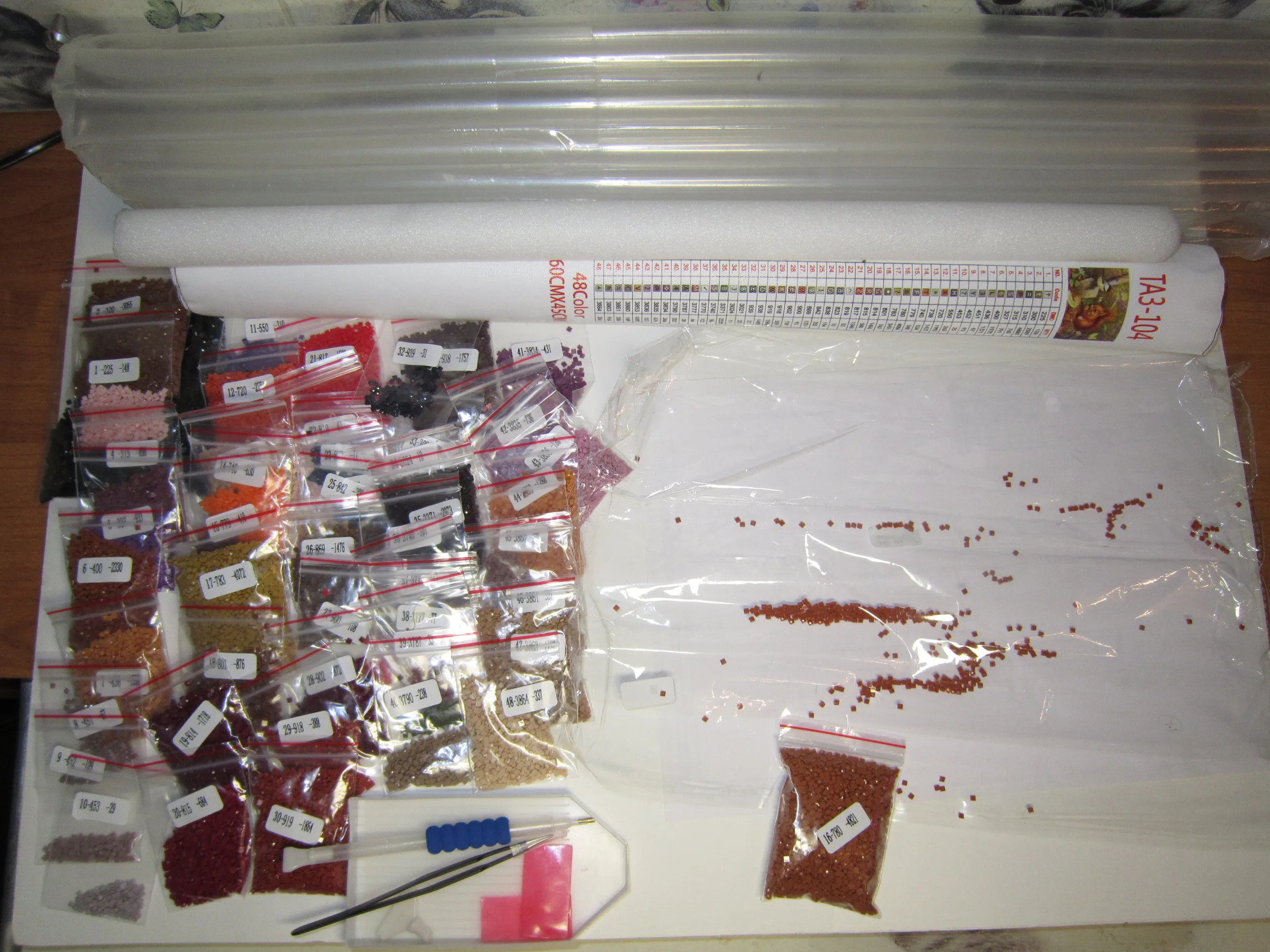 До России(СПБ) пришёл за 27дн. Упаковка в воздушную пленку.Полотно намотано на поролоновый валик. Ровное. Знаки чёткие. Глубокий лоток+стандартный набор. Алмазы в зип-пакетах соответствуют номерам и цветам. Видимо один пакет неплотно был закрыт,рассыпались,надеюсь на выкладку хватит.Продавцу спасибо.