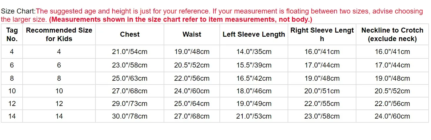 Таблица размеров:Рекомендуемый возраст и рост указаны только для справки. Если под ваши замеры подходят два размера, мы рекомендуем выбрать больший размер.(Измерения, содержащиеся в таблице, относятся к товару, а не к телу.)