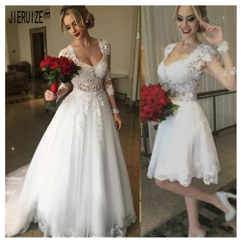 Женское свадебное платье 2 в 1 JIERUIZE, белое кружевное платье со съемным V-образным вырезом и длинными рукавами