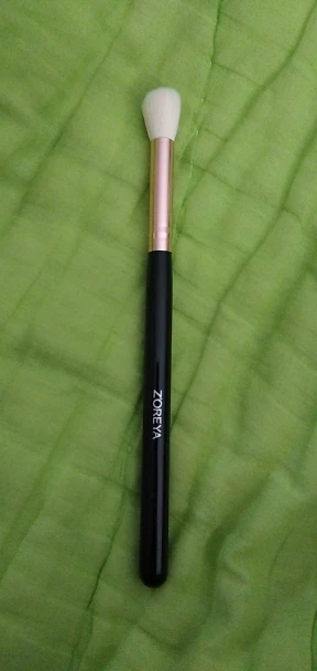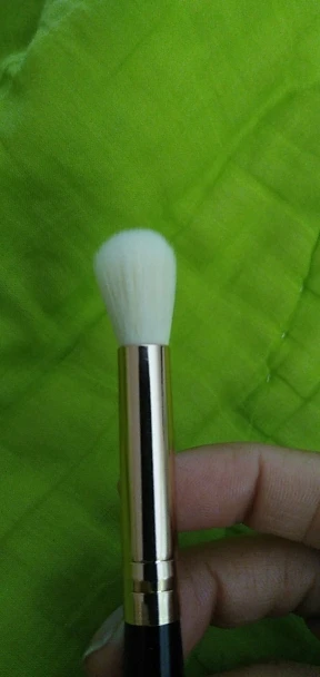 кисточка выглядит как на фото у продавца. она мягкая, не колючая, тени набирает хорошо, но наносит на веко полупрозрачно, плотного нанесения теней нет; растушёвывает отлично. во время мытья не линяет, ворс не сыпется.