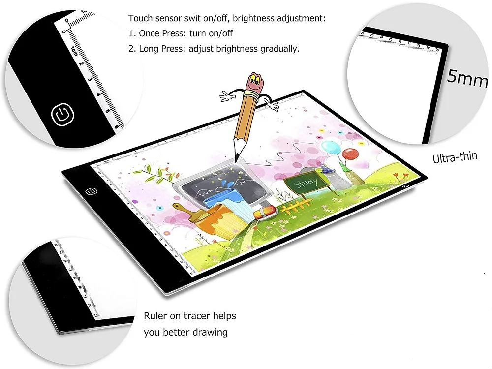 Светодиодный светильник, коробка, планшет, доска для рисования, A4, рисунок для письма, ультра-тонкий копировальный коврик, коврик для рисования, эскиз Особенности:1. Идеальный шаблон, 2D Анимация, каллиграфия, рельеф, скрапбук, татуировка, эскиз, рисунок и т. Д.2. Технология видения, без мерцания, супер яркий, экологически чистый светодиодный с эталонной сеткой.3. Светодиодная лампа имеет компактную структуру, красивый внешний вид, энергосбережение и высокую эффективность.4. Мы используем специальную акриловую поверхность, которая кажется стеклянной пластиной, но намного прочнее, чем стекло.5, легко использовать на столе или на коленях, легко собрать, носить с собой и хранить. Спецификация:Материал: акрилИсточник питания: 5 В-12 В постоянного токаСветильник источник света: светодиодныйМощность Потребляемая мощность: 2,2 ВтС сенсорным переключателем, трехуровневым затемнением, умным переключателем Примечание: плавное затемнение означает, что мы можем вручную настроить яркость, затем нажмите сенсорную клавишу, чтобы выбрать соответствующую яркость, а затем отпустите. Посылка включает в себя:1 * доска для рисования1 * USB кабель1 * Руководство пользователя ** На графическом планшете есть защитная пленка, пожалуйста, удалите ее перед использованием. **