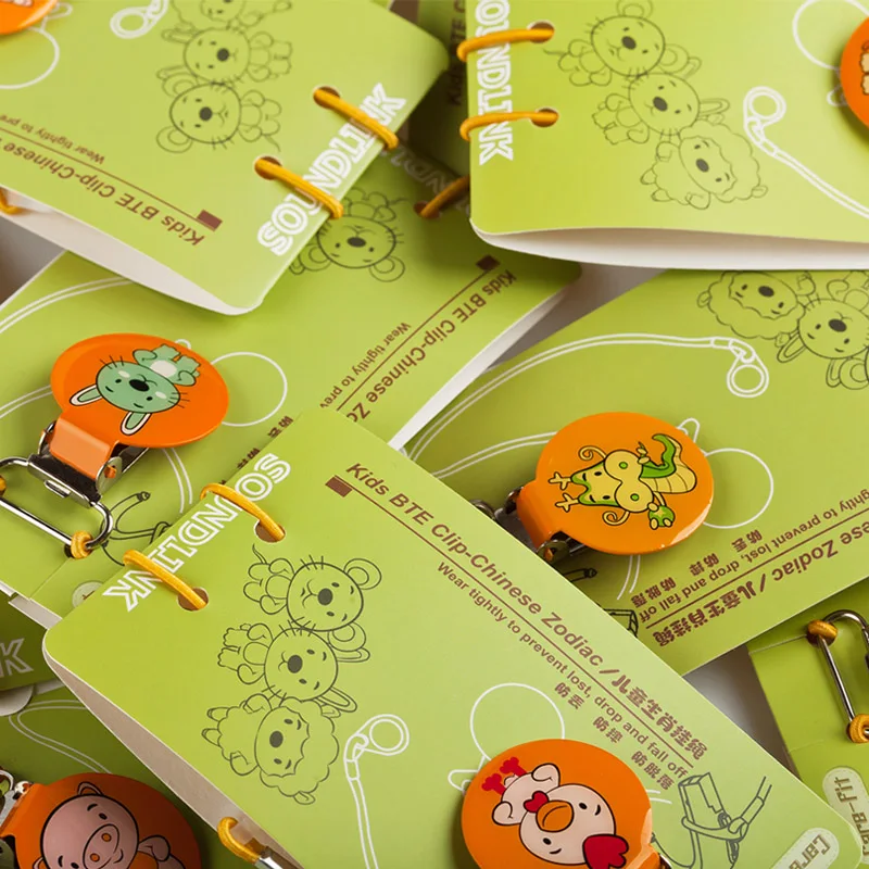 Зажим для слуховых аппаратов Soundlink kids BTE-идеальное решение для предотвращения потери любого ребенка! Этот зажим для слухового аппарата с прочным зажимом, эластичными ремешками и двумя силиконовыми петлями, которые легко скользят по BTE, не только прост в использовании, но и удобен в носке, доступен в 12 китайских стилях зодиака Этот зажим BTE изготовлен из высококачественного, прочного, нетоксичного материала, устойчив к высоким и низким температурам, имеет возможность дезинфекции кипятком. Удобно носить, защищает слуховые аппараты от пота и падения. Особенно подходит для детей.