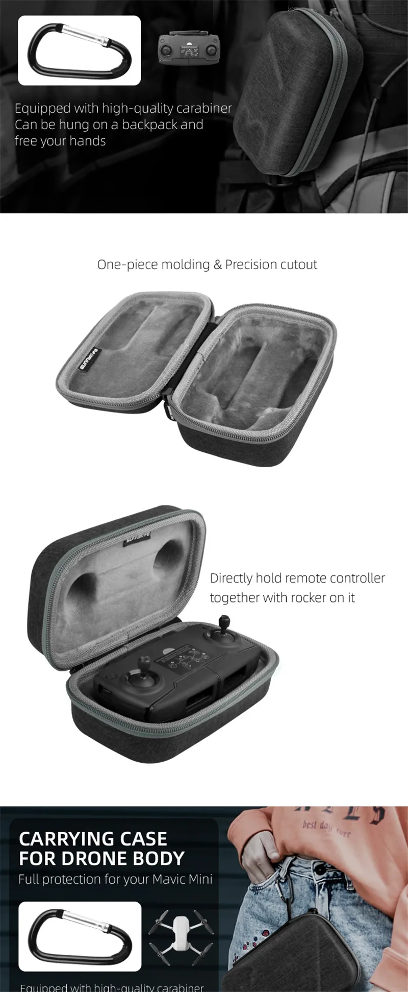 (Примечание: мини-Дрон Mavic и пульты дистанционного управления в комплект не входят. Стандартный чехол для переноски не оснащен карабином)- Точная формовка и комплексная защита Mavic Mini. -Ударопрочный и устойчивый к царапинам, Бережный уход за дроном. -Ультра-портативный, может храниться в рюкзаке или чемодане.