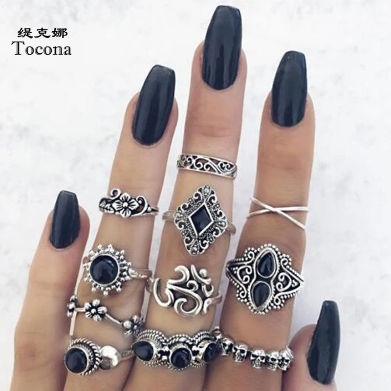 Tocona 11 шт.компл. винтажные черные стразы серебряного цвета кольца вырезанные цветы геометрические Бохо ювелирные изделия для женщин обручальные кольца 10057