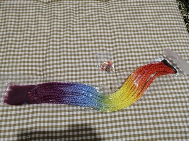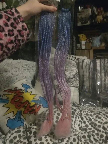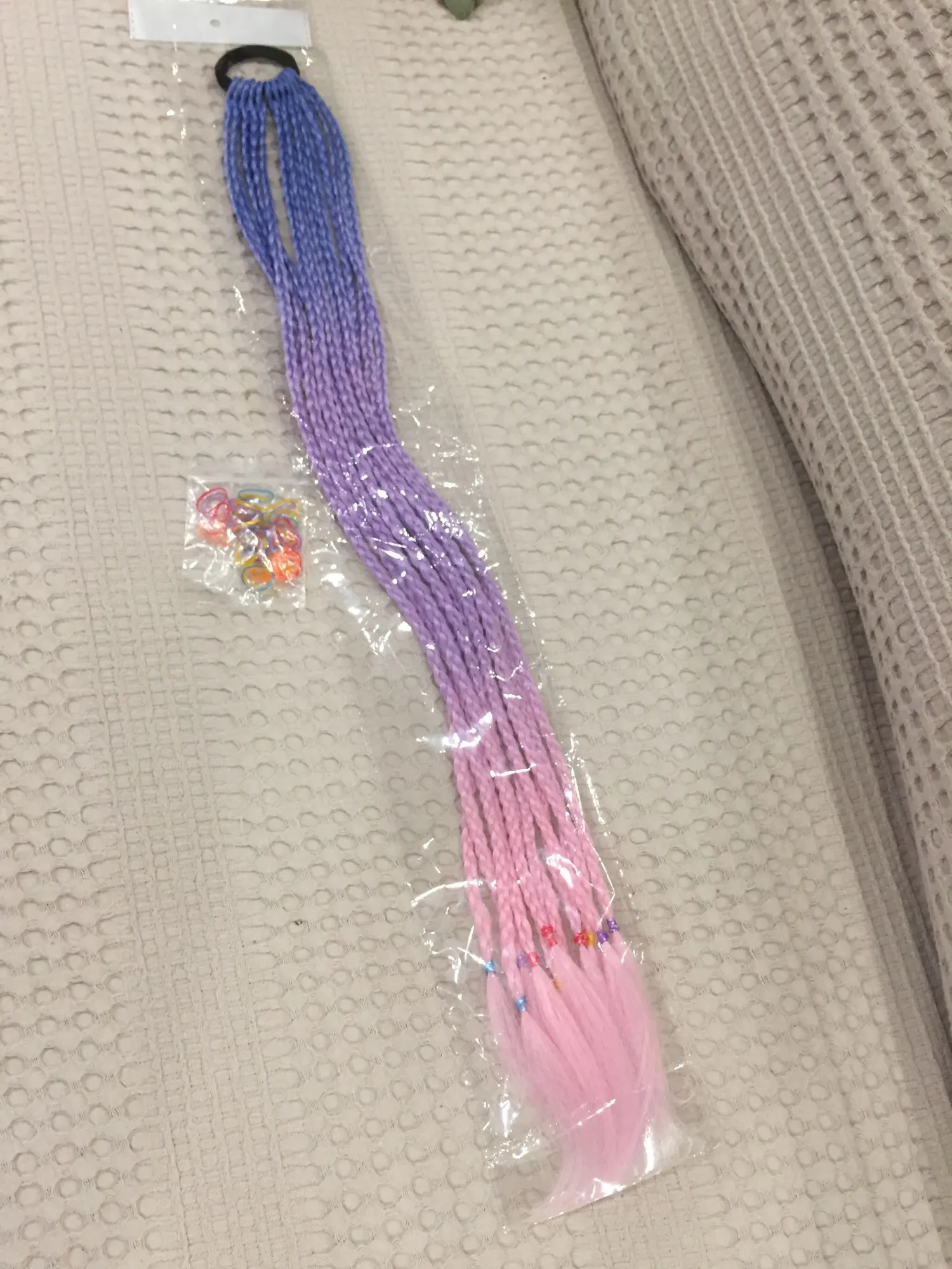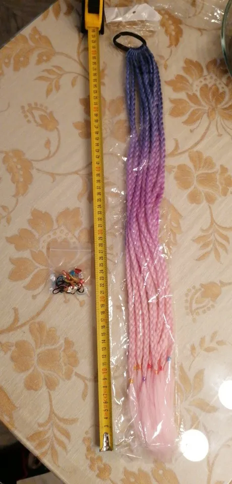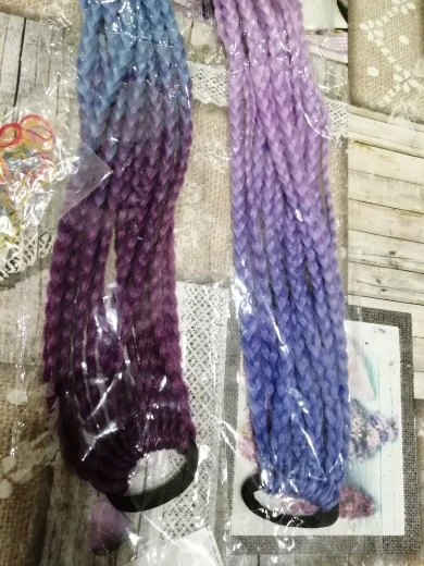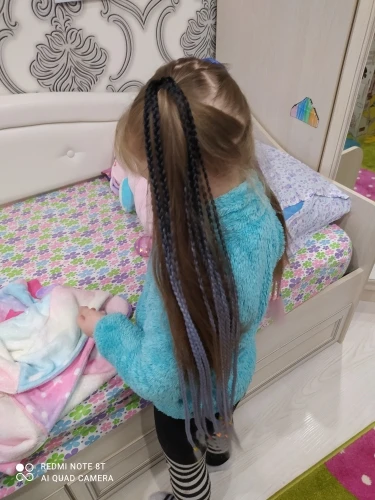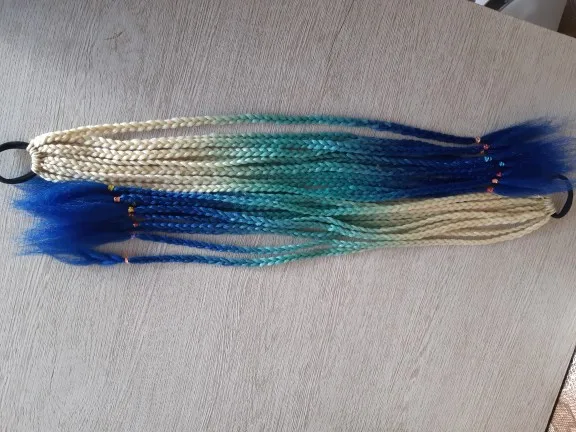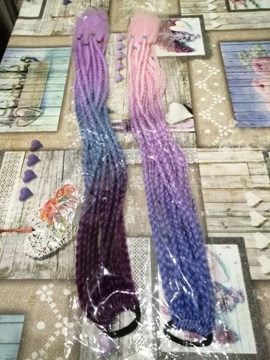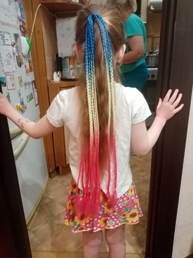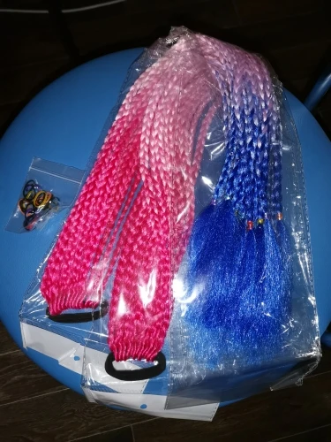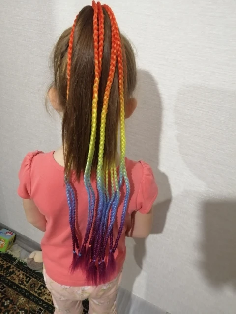 Классные косички. 12 шт на резиночке. Видно конечно, что синтетика, но на волосах смотрятся здорово. Брала сразу две штуки, чтобы вплетать в два хвостика. На фото вплетена одна. Дочка в восторге! А ещё светятся в темноте ярко жёлтым. Доставка быстрая. Спасибо продавцу. Рекомендую!!!