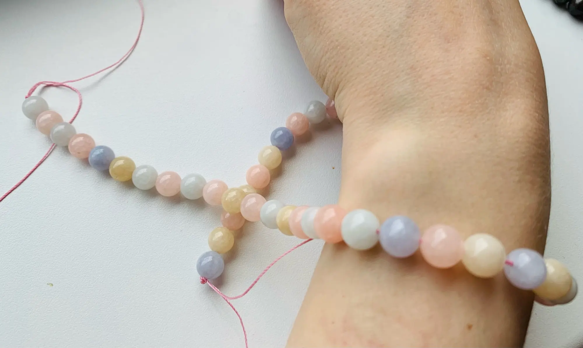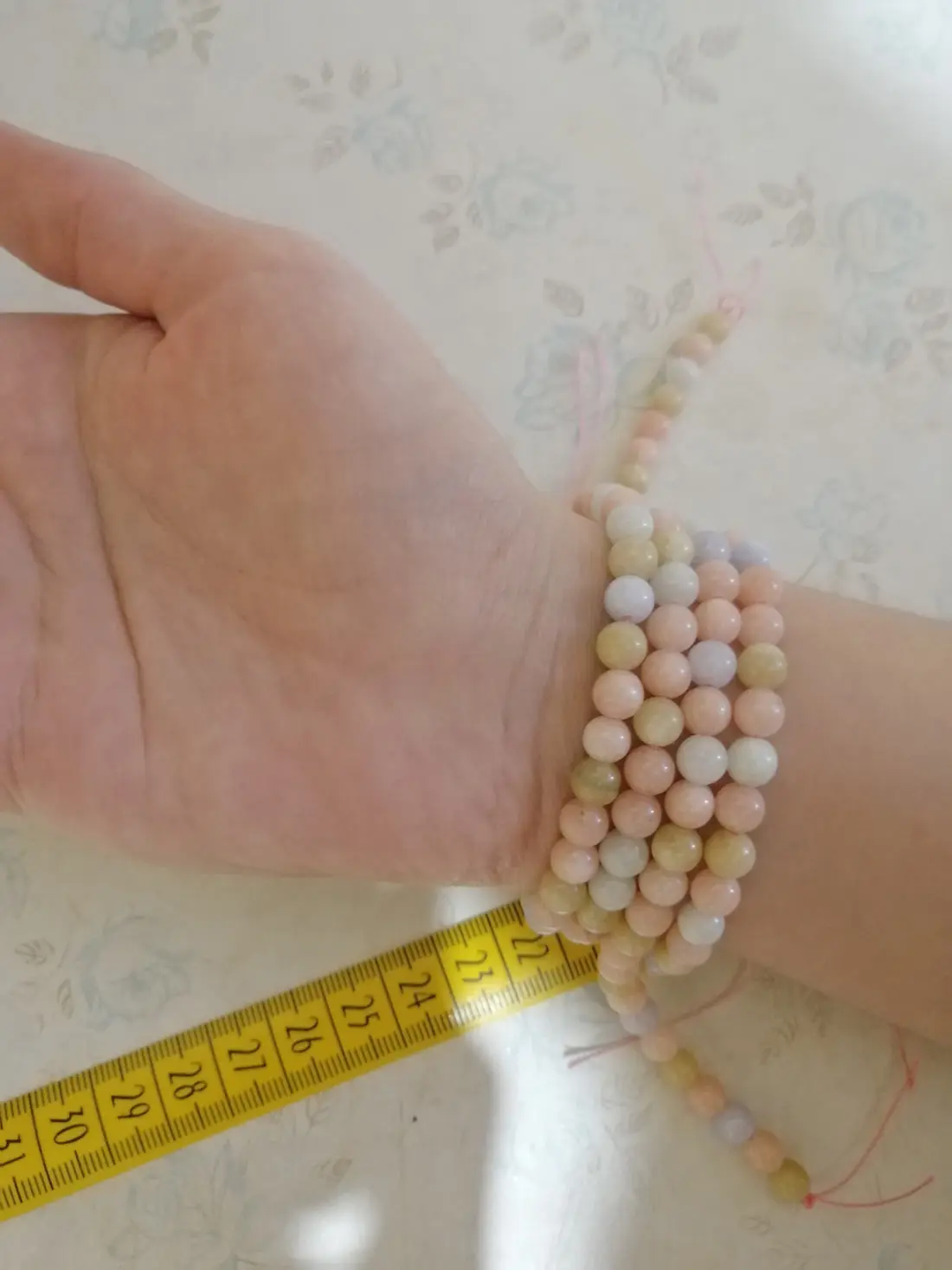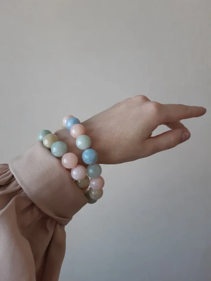 Бусины красивые, глянцевые, нежных цветов. На выбор разный размер, я выбрала диаметр 8 мм. Количество 47 штук, зависит от выбранного размера. На мое запястье хватило на 2 браслета и остались бусины. Бусины холодные на ощупь.