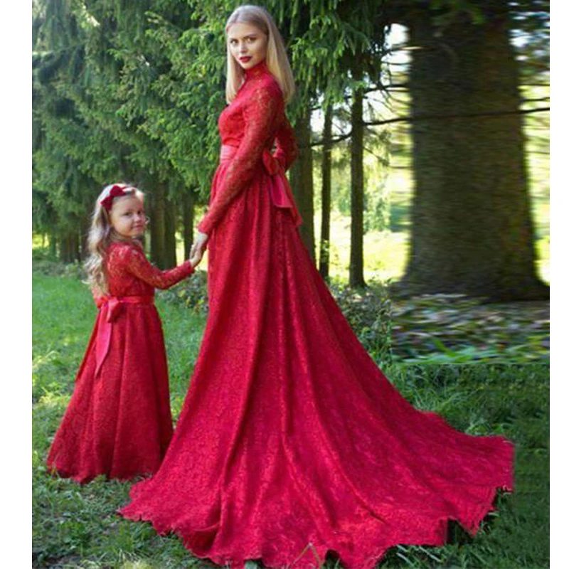 Кружевное красное ТРАПЕЦИЕВИДНОЕ ПЛАТЬЕ для мамы и дочки, платье с бантом и высоким воротником, длинное вечернее платье с цветочным принтом для девочек, платье на день рождения