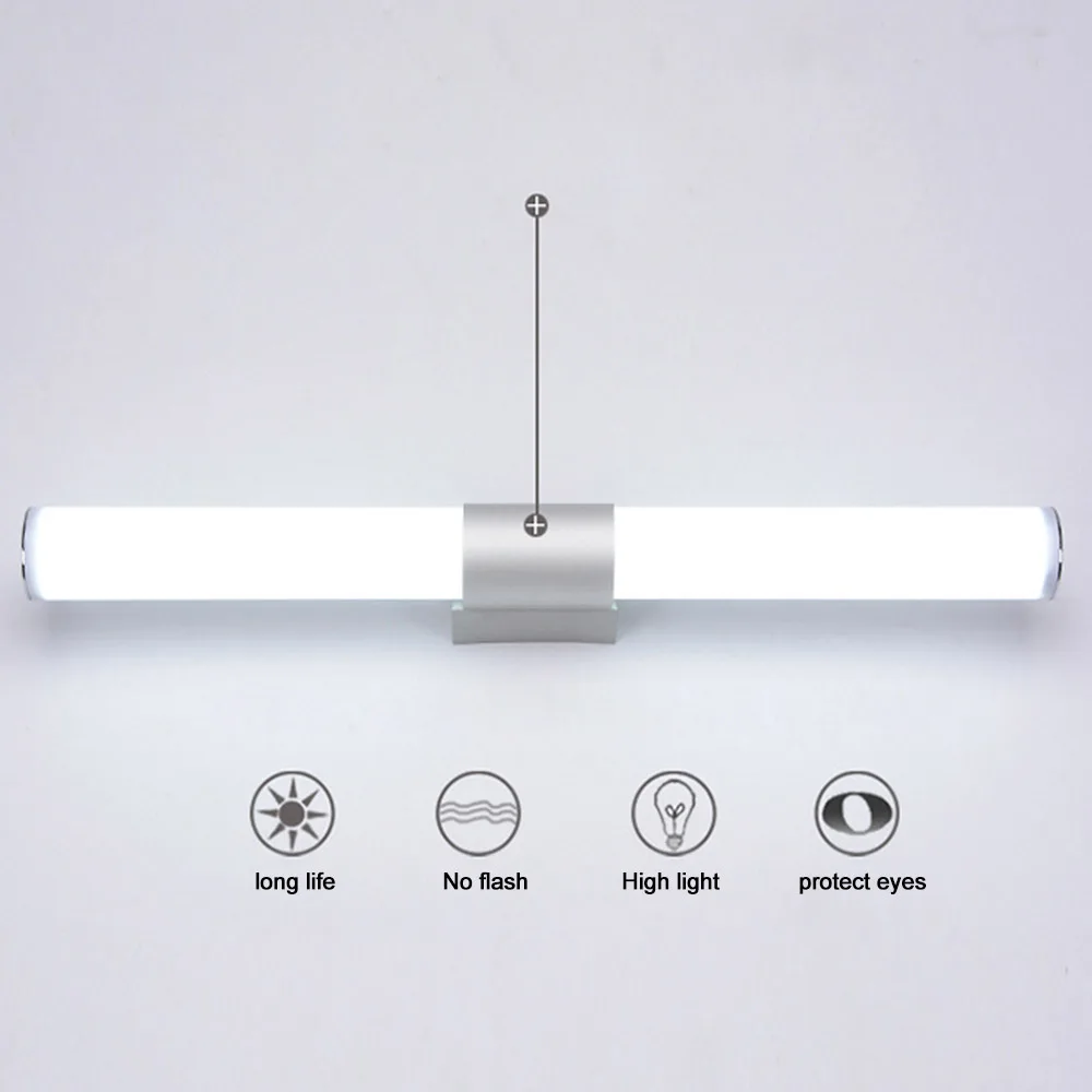 Название продукта: светодиодный настенный светильник, зеркальный светильник Входное напряжение: AC85-265V Выходная мощность: 12 Вт/16 Вт/22 Вт Размер: 250 мм/400 мм/550 мм Уровень водонепроницаемости: IP67 водонепроницаемый Цвет корпуса: белый, серебристый Угол обзора: 360 градусов Световой поток: 100 лм/Вт Подходит для: 3-5 квадратных метров Рабочая температура: -20 ℃-40 ℃ Температура хранения: -20 ℃-65 ℃ Цвет излучения: холодный белый (5500K-7000K)/теплый белый (2700-3000K) Длительный срок службы:> 50000 часов