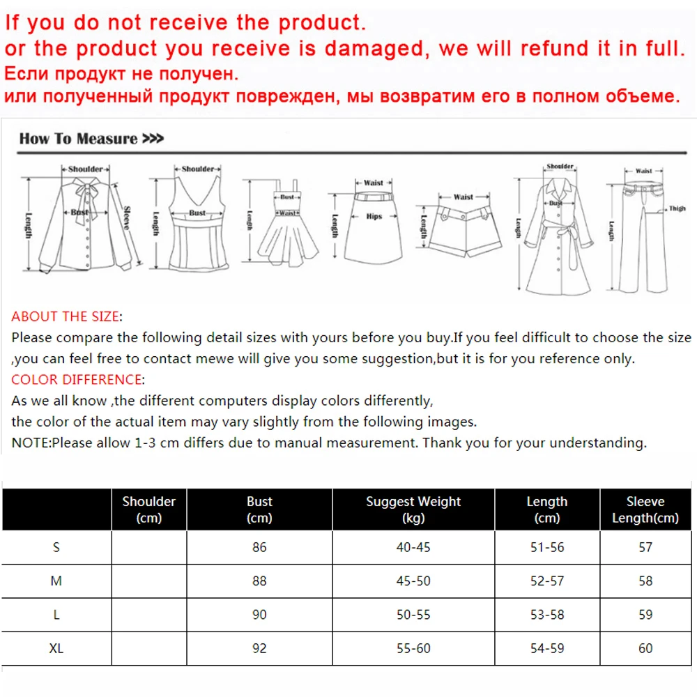 О размере:Пожалуйста, сравните следующие размеры с вашими перед покупкой. Если вам сложно выбрать размер, вы можете связаться с нами, мы дадим вам рекомендации, но только для справки.Разница в цвете:Как всем известно, цвета на разных компьютерах отображаются по-разному,Цвет товара может немного отличаться от изображения.Примечание: возможны отклонения в 1-3 см из-за измерений вручную. Спасибо за понимание.