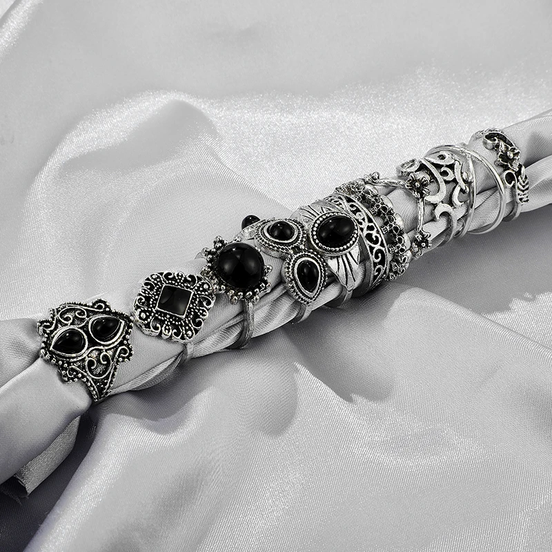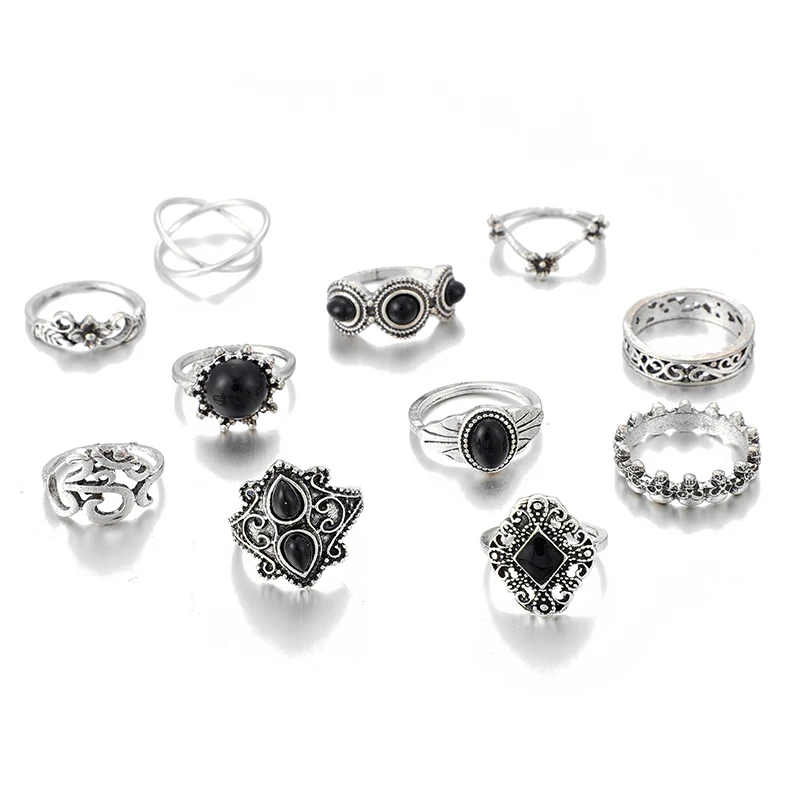 Набор Колец Docona 11 шт.компл. в богемном стиле серебряного цвета с черными кристаллами камнями цветами геометрические кольца для женщин ювелирные изделия аксессуары