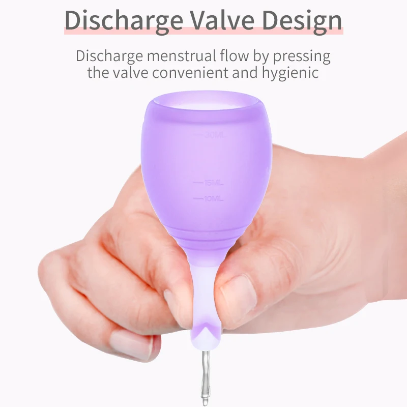 Особенности1. Изготовлен из пищевого медицинского силикона, нетоксичен, гипоаллергенен и безопасен.2. Без химических добавок, мягкий и гладкий, не повредит стенку влагалища.3. Конструкция в форме колокола хорошо сочетается со стенкой влагалища для сбора протекания менструального потока.4. Многоразовый, долговечный, легко чистится и сушится.5. Конструкция клапана давления для хорошего управления менструальным потоком, более удобная и уверенная.6. Нет ограничений на плавание, танцы, Йога, длительное сидение или стояние.7. Инновационный дизайн, простота использования, идеально сочетается с стрингами.ХарактеристикиМатериал: силиконЦвет: розовый, фиолетовыйДополнительные размеры: S (3,7 см/1,46 дюйма), L (4,1 см * 1,61 дюйма)Вес посылка: 18-22 гТип товара: менструальная чашаНазначение: Для женского менструального периодаПрименение: Размер S для женщин, не родивших ребенка или не родивших ребенка, или женщин в возрасте до 30 летРазмер L для женщин, родивших ребенка или старше 30 летНа что следует обратить вниманиеНикакие аллергические реакции не приводят к плесени и инфекциям мочевыводящих путей, могут применяться всем женщинам, но женщинам, не имеющим сексуального опыта, не рекомендуется использовать этот продукт.Описание емкостиМенструальная чаша размера S подходит для нормального потока.Менструальная чаша размера L подходит для интенсивного потока.Мы рекомендуем вам купить менструальные чаши двух разных размеров, чтобы справиться с различными менструальными условиями.Метод использованияВставьте:1. Продезинфицируйте чашку перед использованием. Вымойте руки и прижмите чашку к U-образной форме.2. Крепко удерживайте нижнюю часть чашки пальцами, приседайте или сидите на унитазе, чтобы избавиться от влагалища.3. Отпустите губы другой рукой и медленно надавите на влагалище.Вынос:1. Вымойте руки перед извлечением.2. Присядьте на корточки Или сядьте на унитаз, чтобы облегчить влагалище и удерживать чашку пальцами.2. Нажмите на чашку, чтобы убедиться, что попадает воздух и медленно выходит из нее.3. Надежно закрепите нижнюю часть корпуса, чтобы опрокинуть его.4. Вылейте менструацию в туалет и очистите чашку.Время смены:Время использования может длиться в течение одного менструального периода, обычно в течение 7 дней, но будьте осторожны при выписывании каждые 2 часа в первые два дня или при выписывании в зависимости от количества менструальной крови.Способ дезинфекцииВымойте чашу теплой водой с мылом во время менструации и продезинфицируйте чашу в кипящей воде примерно на 2-5 минут или Замочите в дезинфицирующем средстве после менструации.