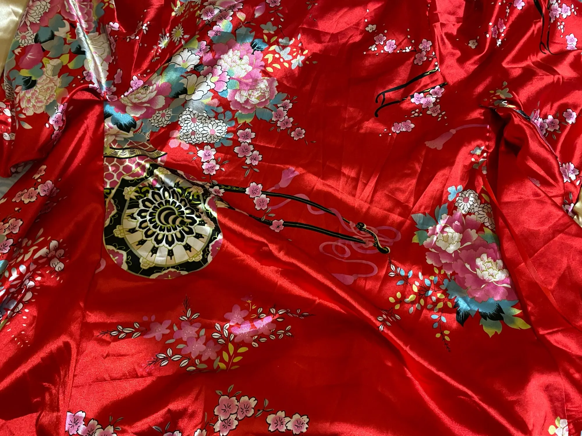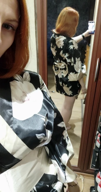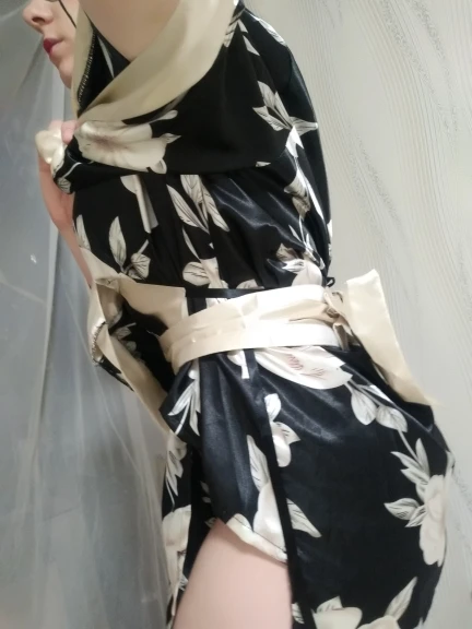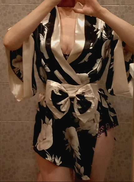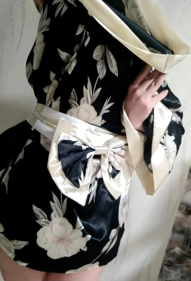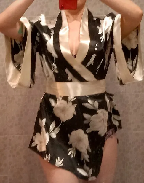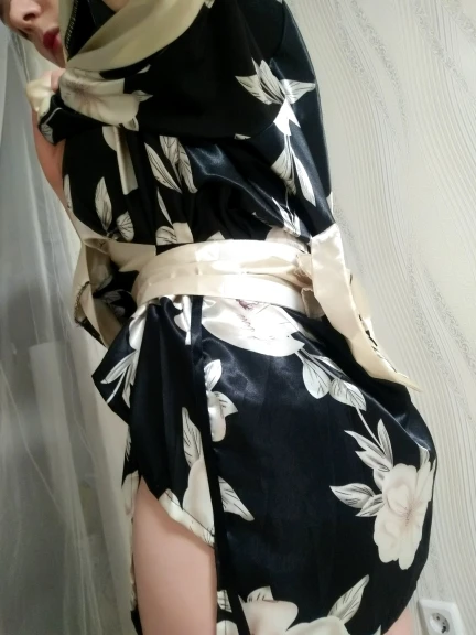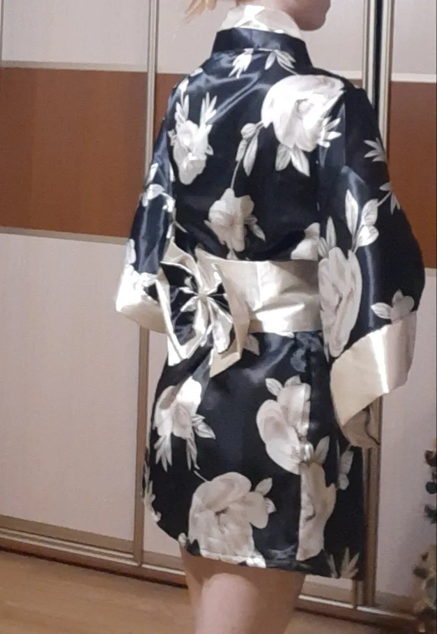 На рост 172 длина как на фото ниже (ну то есть дальше спальни в таком не выйдешь), если поднять руки, то по сути видны все причинные места. Внутри под подмышками и с краёв есть подвязочки, за счёт которых кимоно не развязывается. Пришлось их, правда, перешить на немного другое место из-за отсутствия должного размера груди. Ткань приятная, было бы чуть подлиннее, то был бы балдёж полный