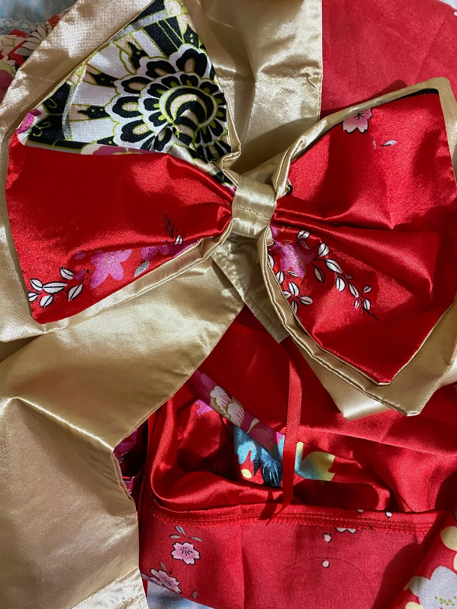 Пояс с бантом очень большой в диаметре, само "кимано" чуть ниже пояса при росте 165см.