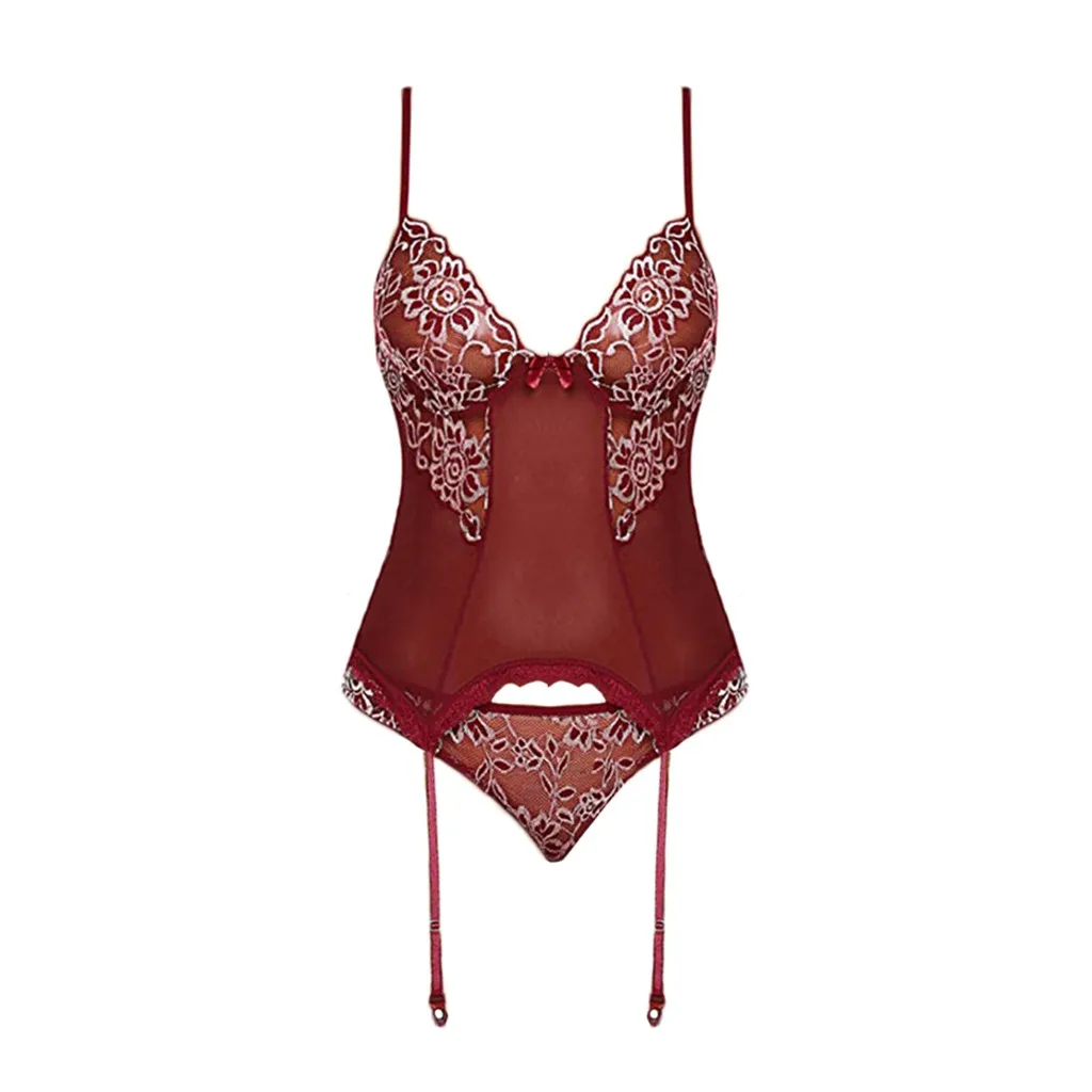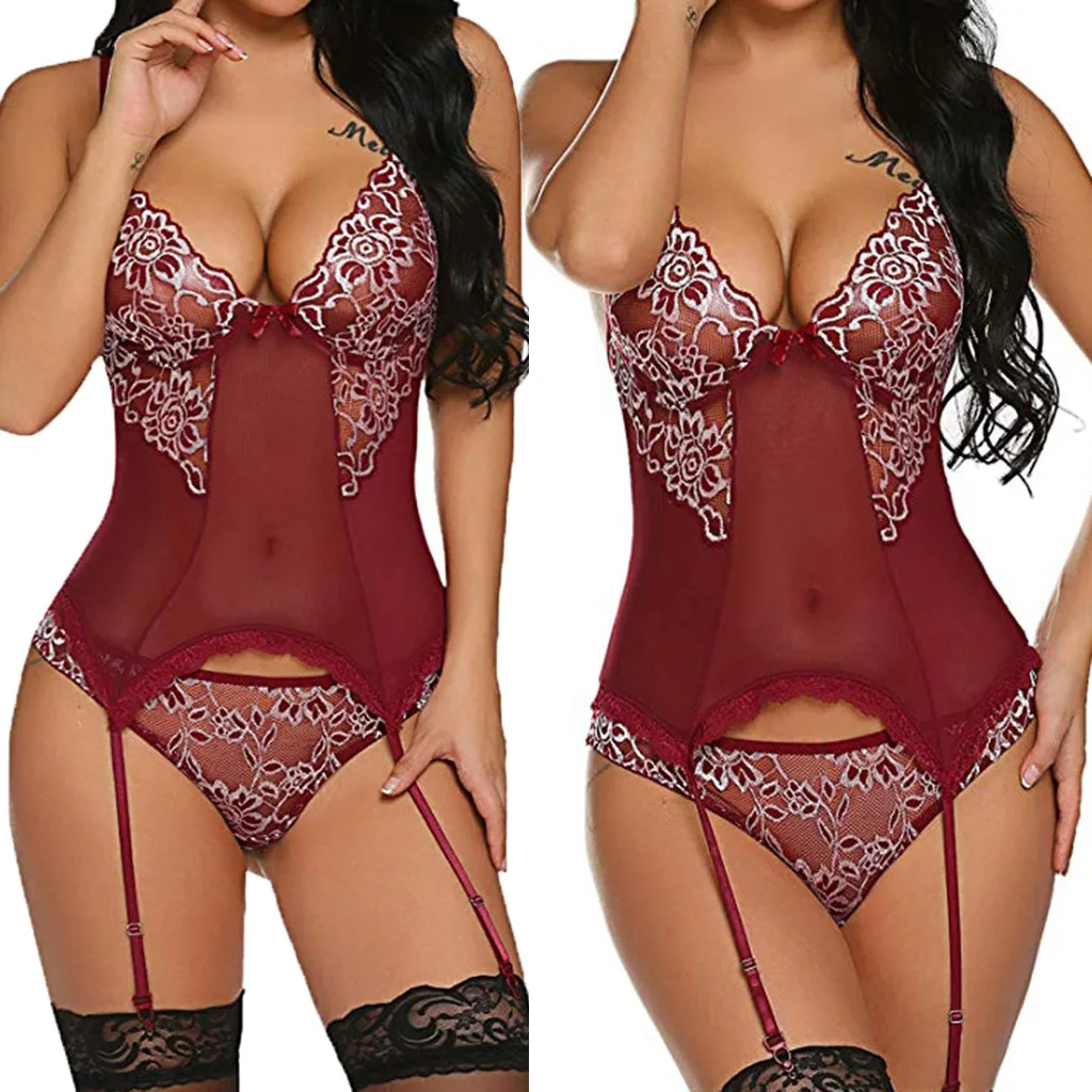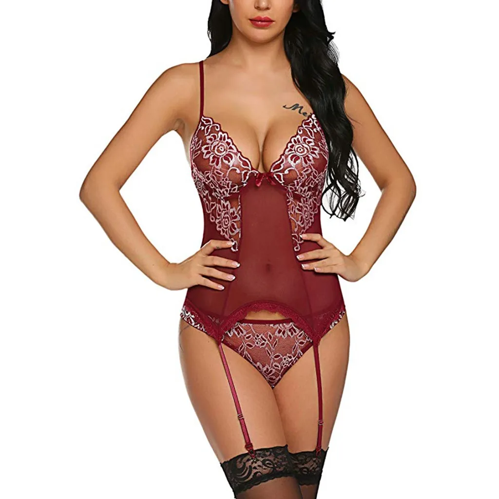 Кружевное белье в цветочек комплект Для женщин цветок вышивка перспектива Сетчатое платье на бретелях стринги Подвязки Для женщин нижнего белья Ropa Interior Femenina