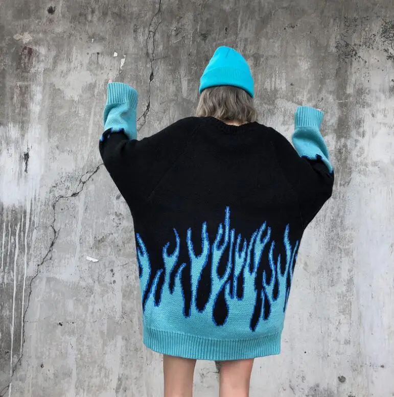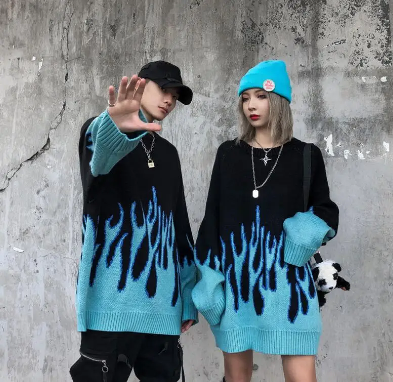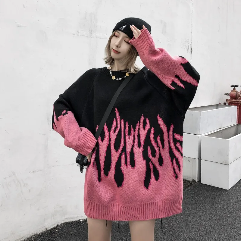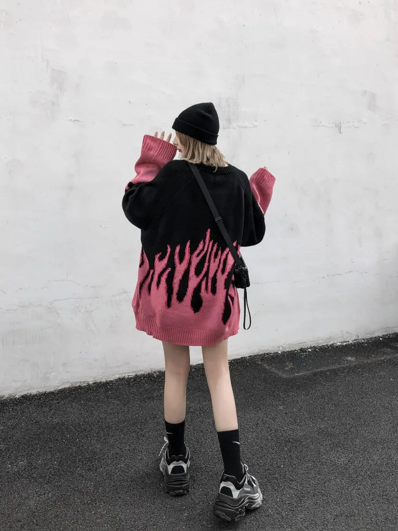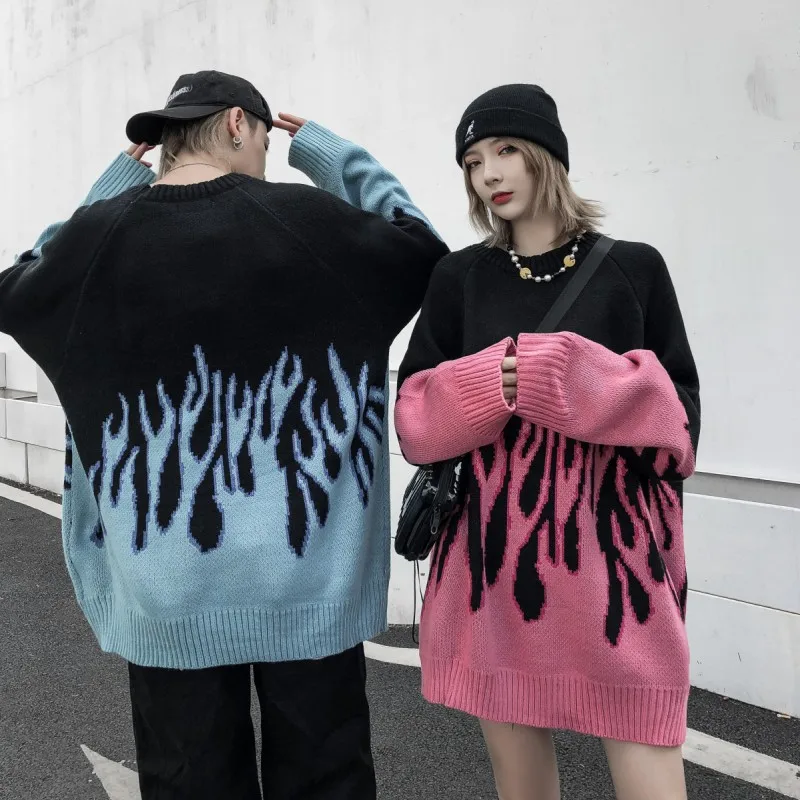 Свитер мужской и женский, осенне-зимний, в стиле ретро, с рисунком пламени, свободный, вязаный, теплый, оверсайз, с круглым вырезом
