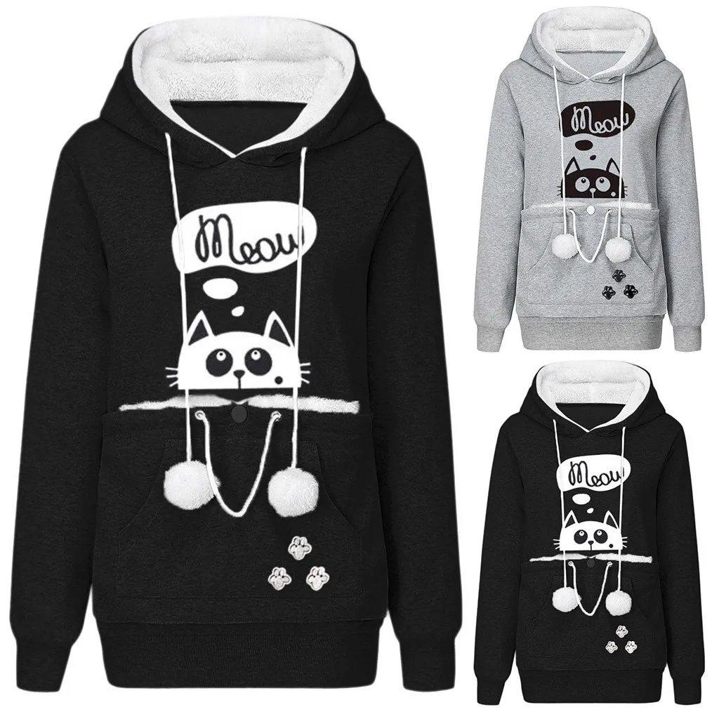 Женская толстовка мешок с нарисованным животным капюшоном топы носить с кошкой дышащий пуловер Блузка