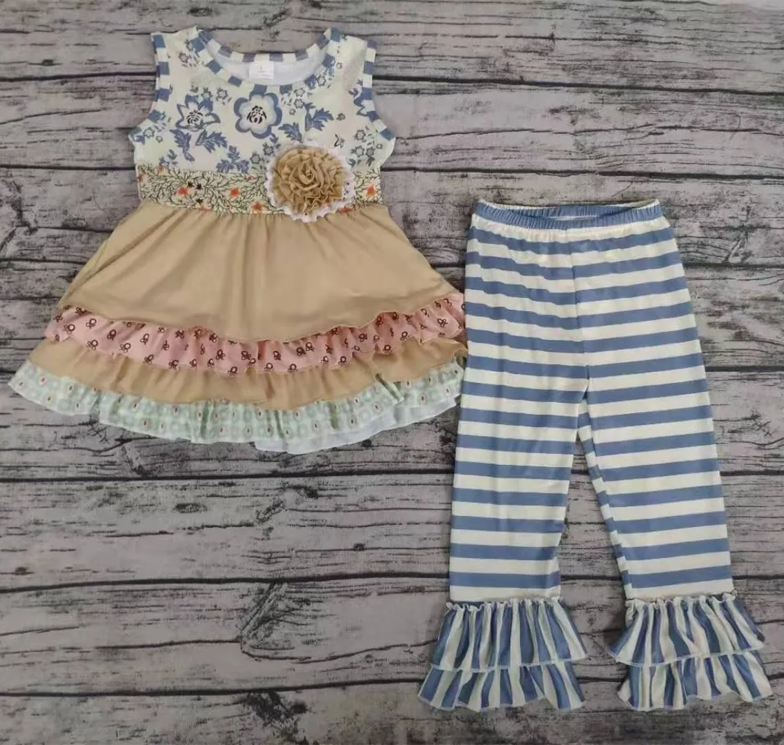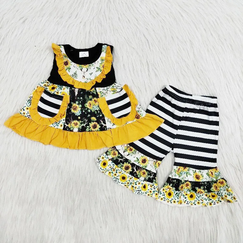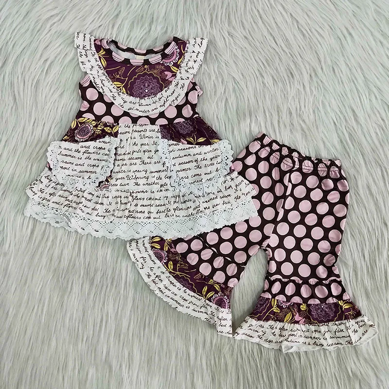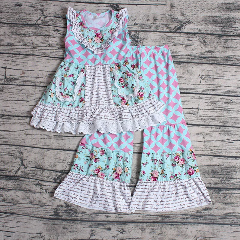 Оптовая продажа, детские модные длинные брюки с круглым вырезом, короткими рукавами, кружевными цветочными карманами и оборками для девочек, одежда